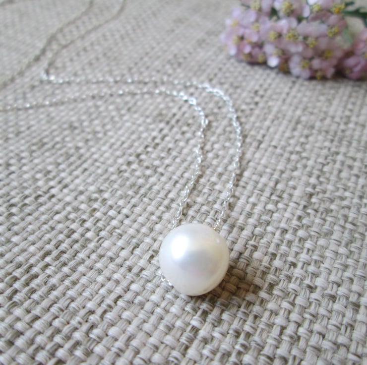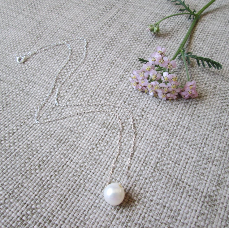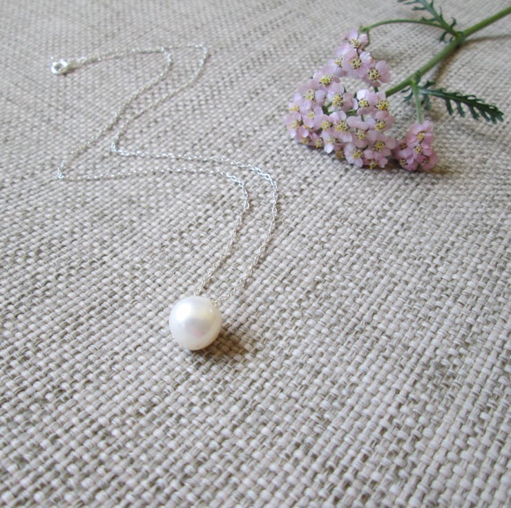 A simple but beautiful pendant necklace made with a single drilled ivory freshwater pearl bead threaded on a sterling silver fine chain necklace (choose either 16 or 18 inch chain length). The pearl measures approximately 1cm in diameter. Perfect with any outfit!