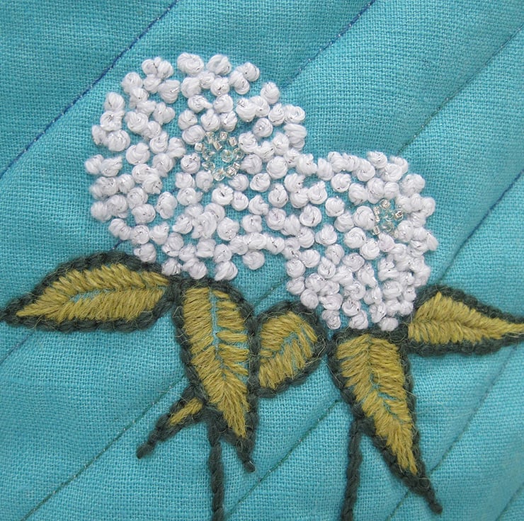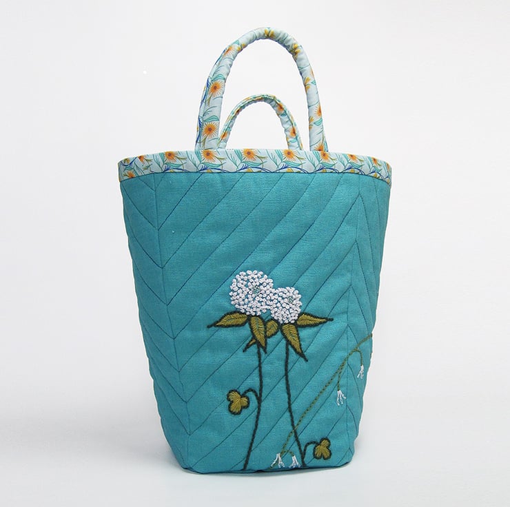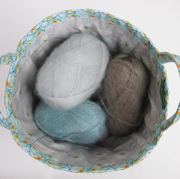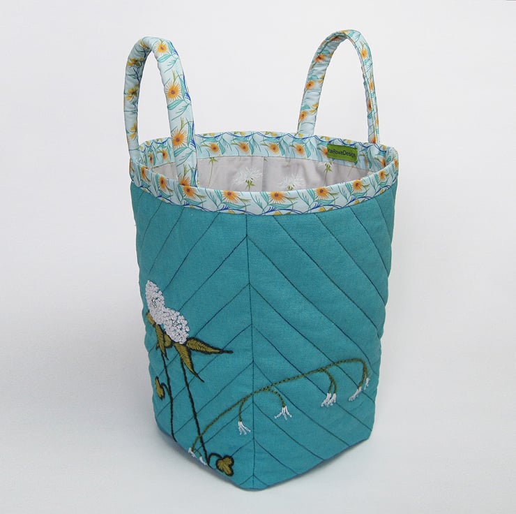 This turquoise linen knitting/project bag is one foot (30cms) in depth. It's perfect for a larger project requiring more yarns or materials. Or it can be used to store yarn/threads and look good in your room. The bag has a hand embroidered clover and bluebell on the outer and the outer is also quilted to add structure. The bag is trimmed with my own marigold print and lined in my grey thistle print, both on cotton. The bag is bucket shaped so you can find all your yarns and fabrics easily.