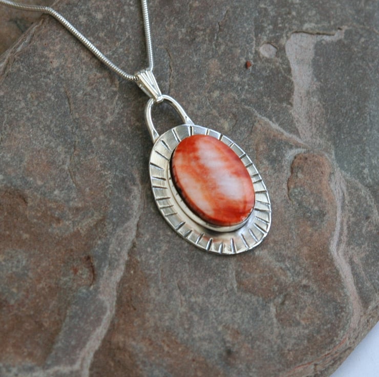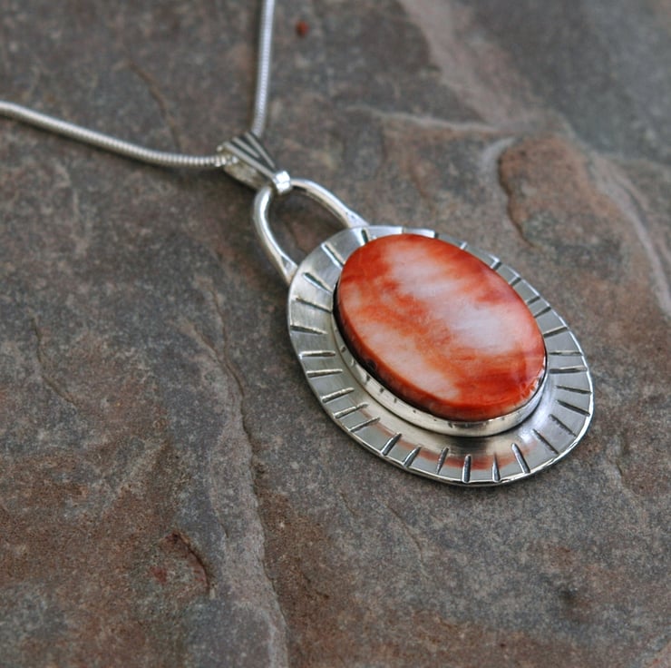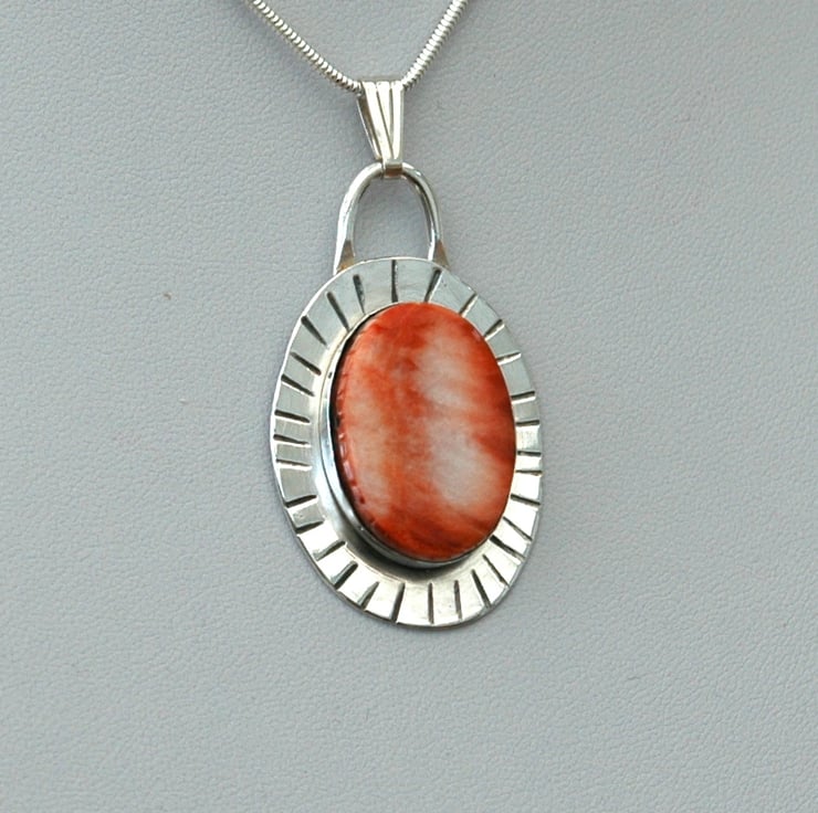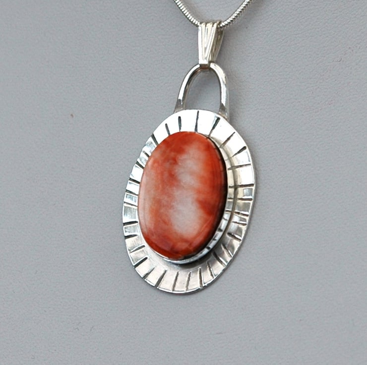 This unique sterling silver pendant features a flat oval of spiny coral mounted in a sterling silver bezel setting on an oval backing sheet which has been textured to create a sunburst pattern around the stone. The coral has bands of vibrant orange-red shading to white with an iridescent sheen. The pendant has been hallmarked on the reverse by the London Assay Office with traditional silver hallmarks including my own maker's mark. There is an integral loop bail and I have also included a sterling silver clip-on bail which is useful for attaching the pendant to different necklaces.