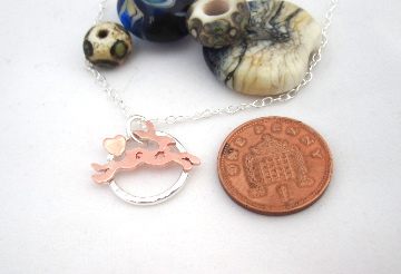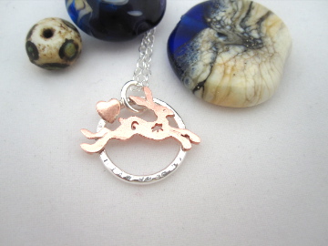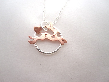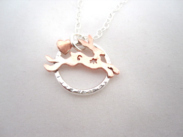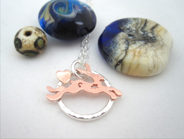 A Dreamy Hare bounds along thinking dreaming thoughts , below a Copper Heart, made in Sterling silver in a bright happy studio.
