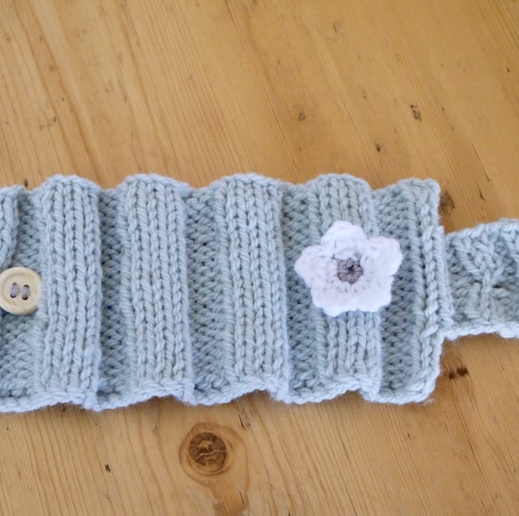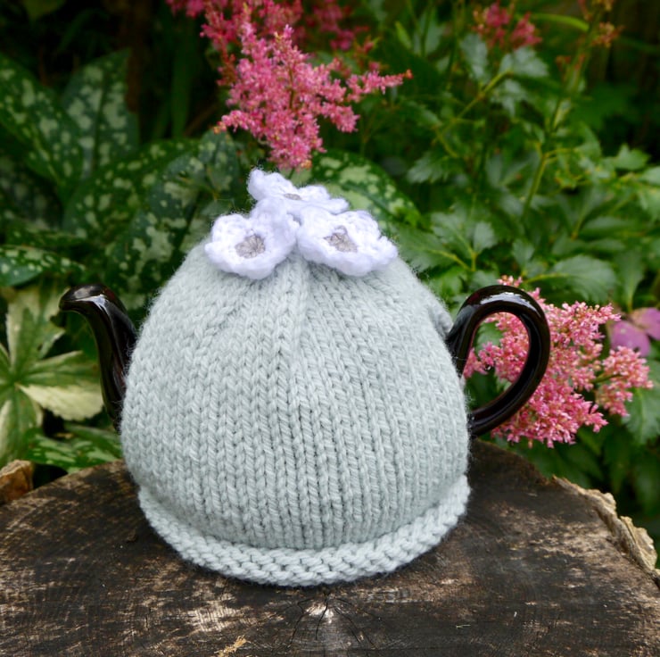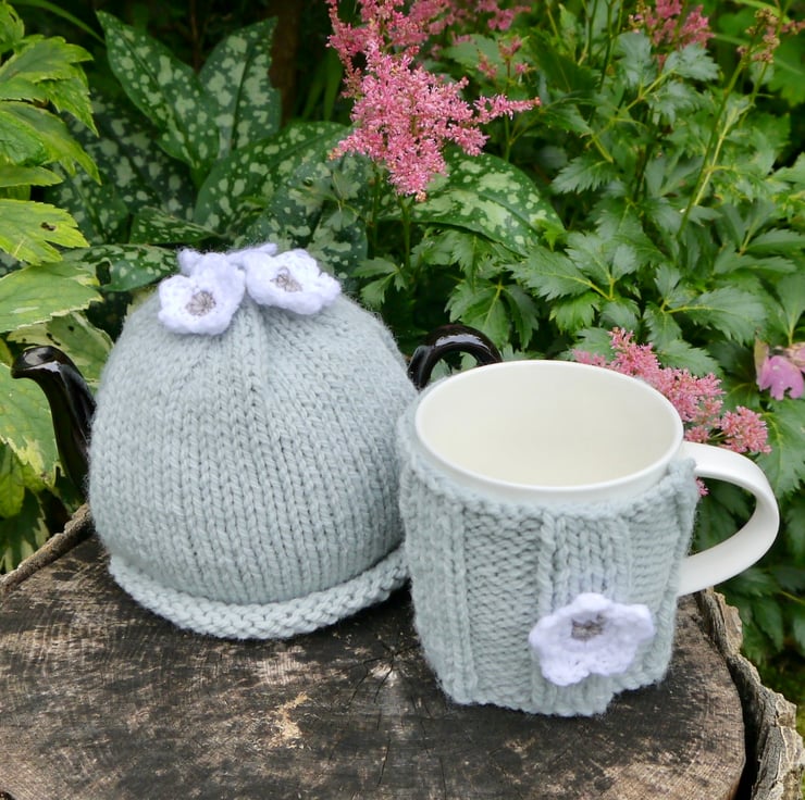 A lovely little tea and mug cosy set. The perfect gift for mum or grandma. I have hand knitted the one cup tea cosy using a lovely grey aran yarn. It has three white and grey crochet flowers attached. The ribbed mug cosy is made using the same yarn and has one matching flower attached. There is a wooden button sewn on for fastening and a tab with buttonhole fits through the handle. The tea cosy is designed to fit a small teapot and the mug cosy which is approx 8cm high will fit a standard mug.