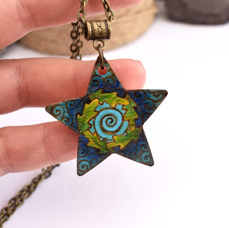 A cute star shaped wooden pendant. It is designed by myself and incorporates a nature theme, oak leaves, water elements with a range of tonal blues, and a swirl textured pyrography effect.