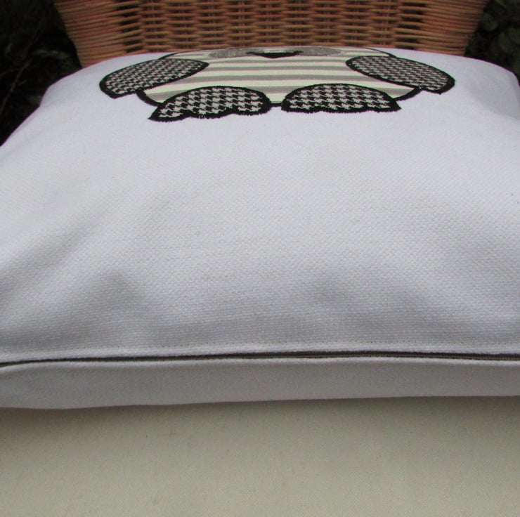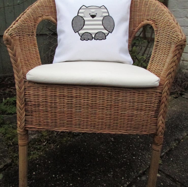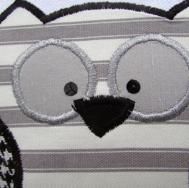 This owl cushion is made from an ivory coloured fabric with an adorable applique owl in monochrome colours. The body of the owl is made from cream and grey striped fabric and the wings and feet are a black and white houndstooth pattern. The beak is black and the eyes are silver-grey satin-finish fabric, edged with silver metallic thread and embellished with black sequins.