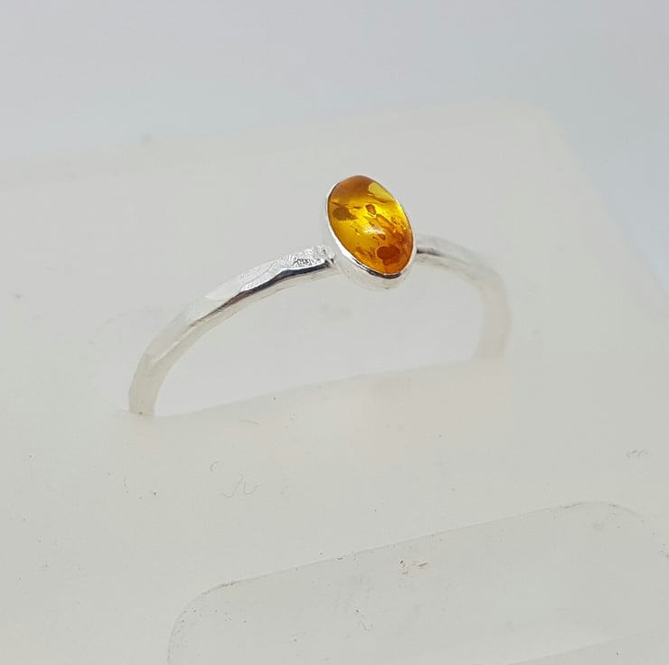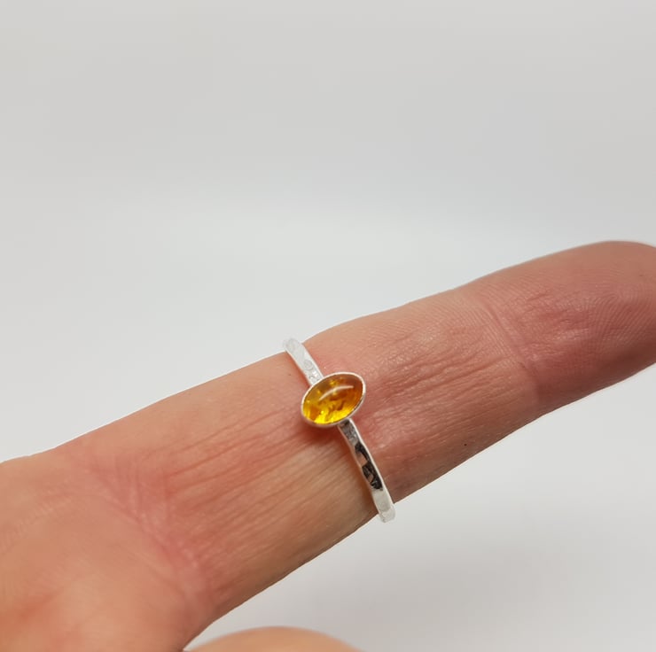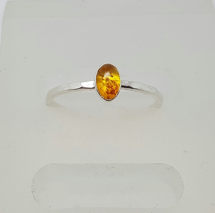 This dainty ring has a beautiful 6x4mm oval golden honey amber stone.