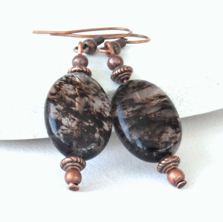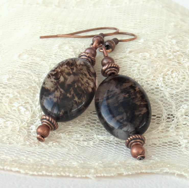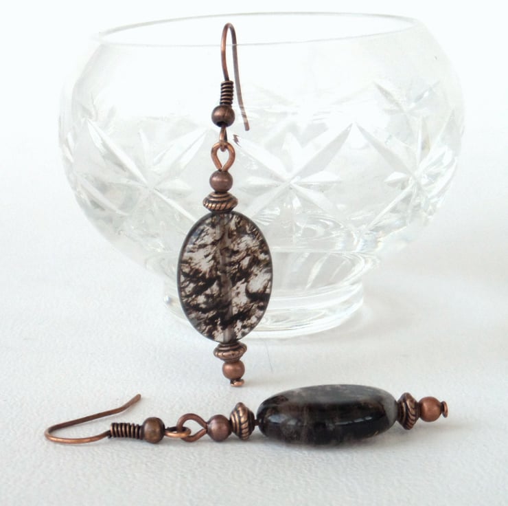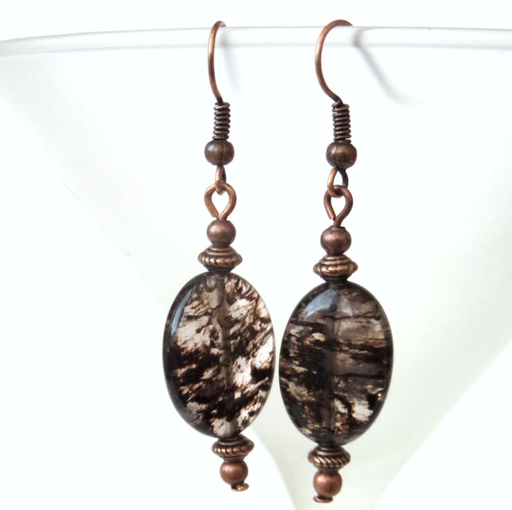 Unusual chocolate brown tourmaline ovals hang with little copper beads from copper earrings to make these gorgeous earrings.