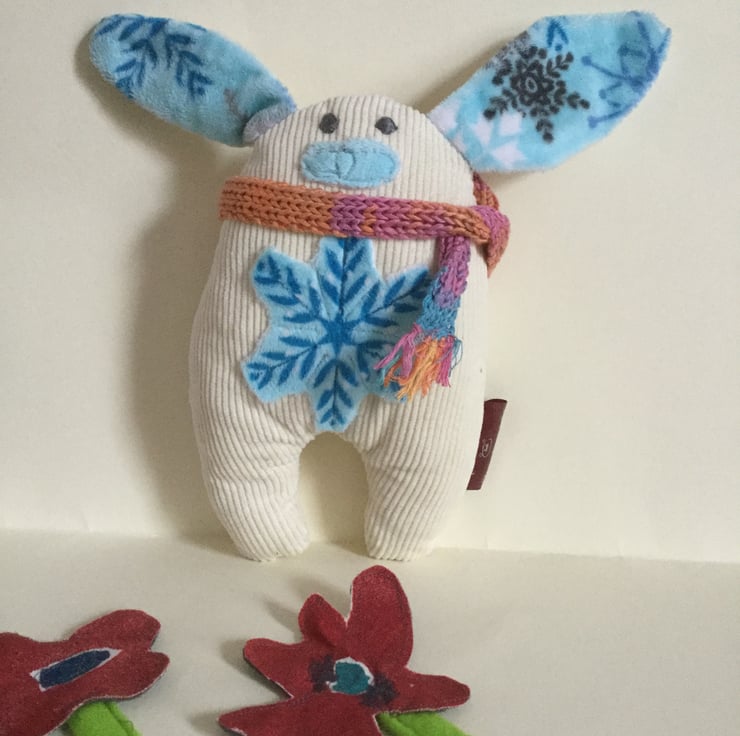 A handmade cuddly Bunny with a SnowFlake on its tummy. Also a knitted scarf to keep warm. Great for any child to play with and enjoy.