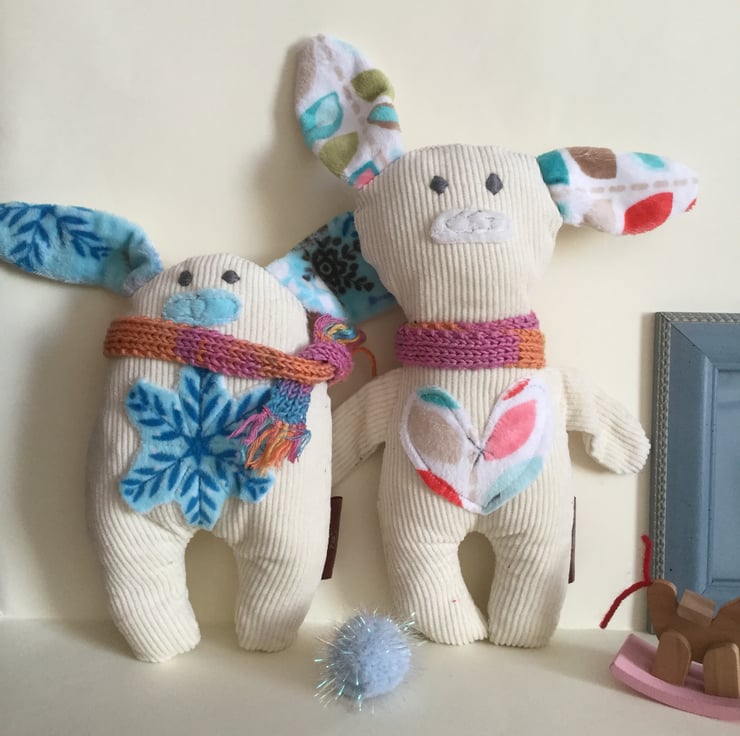 Made from very soft cream Eco Hemp Corduroy with SnowFlake patterned soft plush for ears, nose and large SnowFlake on tummy. Embroidered silver eyes and a knitted scarf.