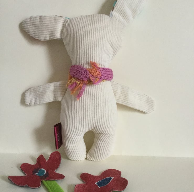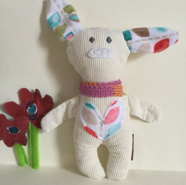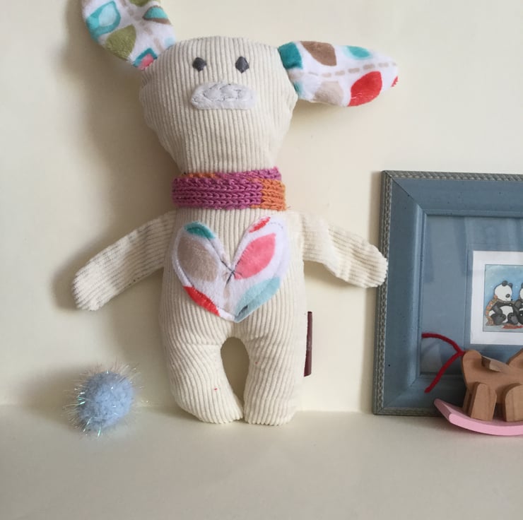 A handmade cuddly bunny with a plush heart. Also has a knitted scarf to keep warm. Great cuddly and soft plushie for boys or girls to play with and use their imaginations.