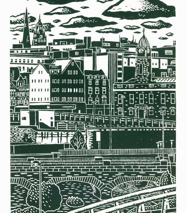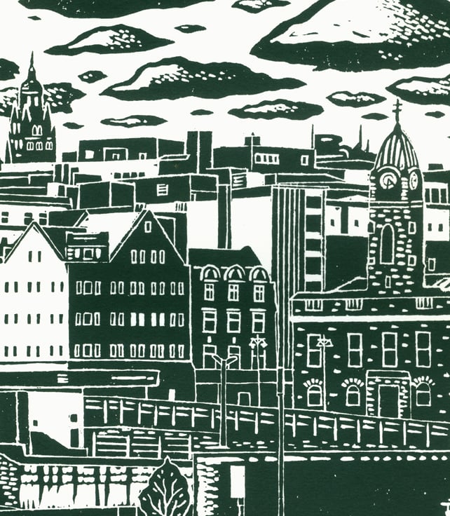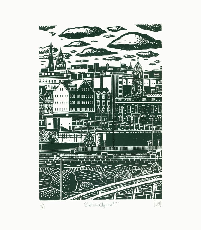 A3 (29.7cm x 42 cm) screen-print entitled 'Sheffield City View No.7' printed in green-grey.