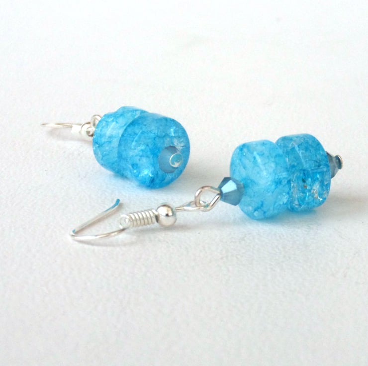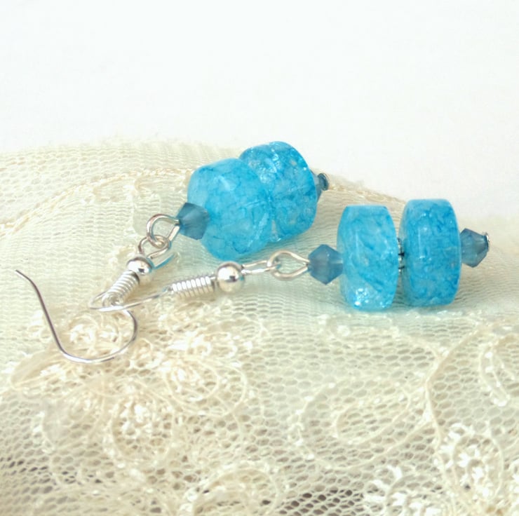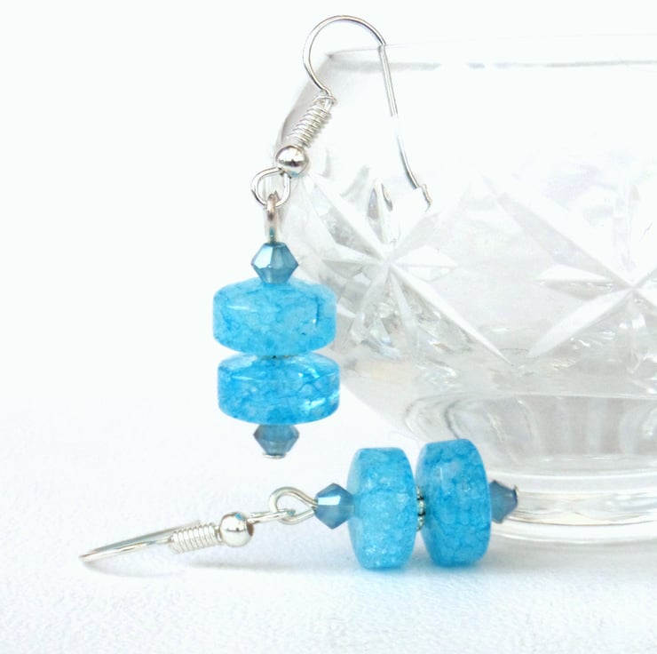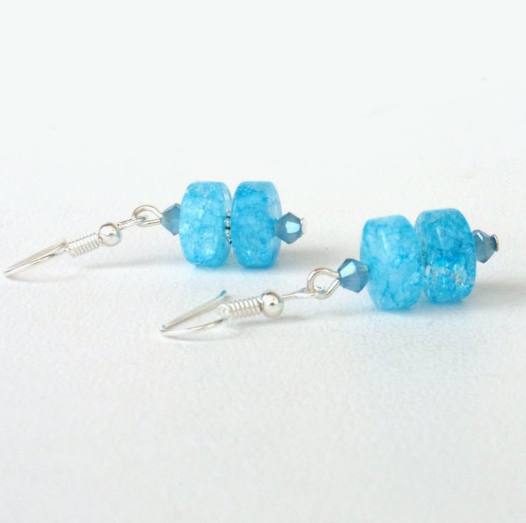 Two stunning blue cracked quartz rondelle shaped beads hang from silver plated wires