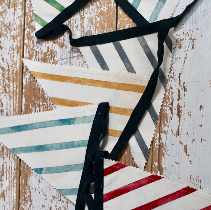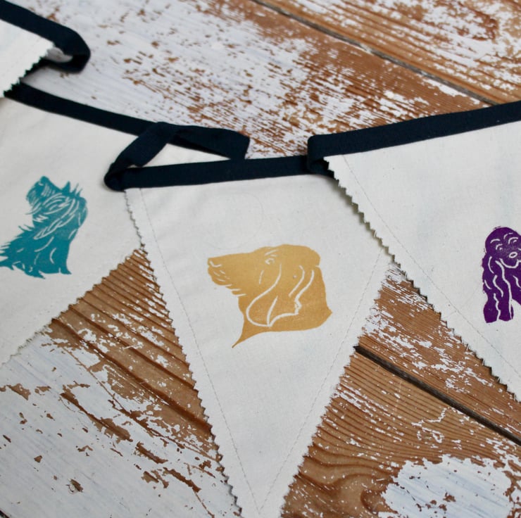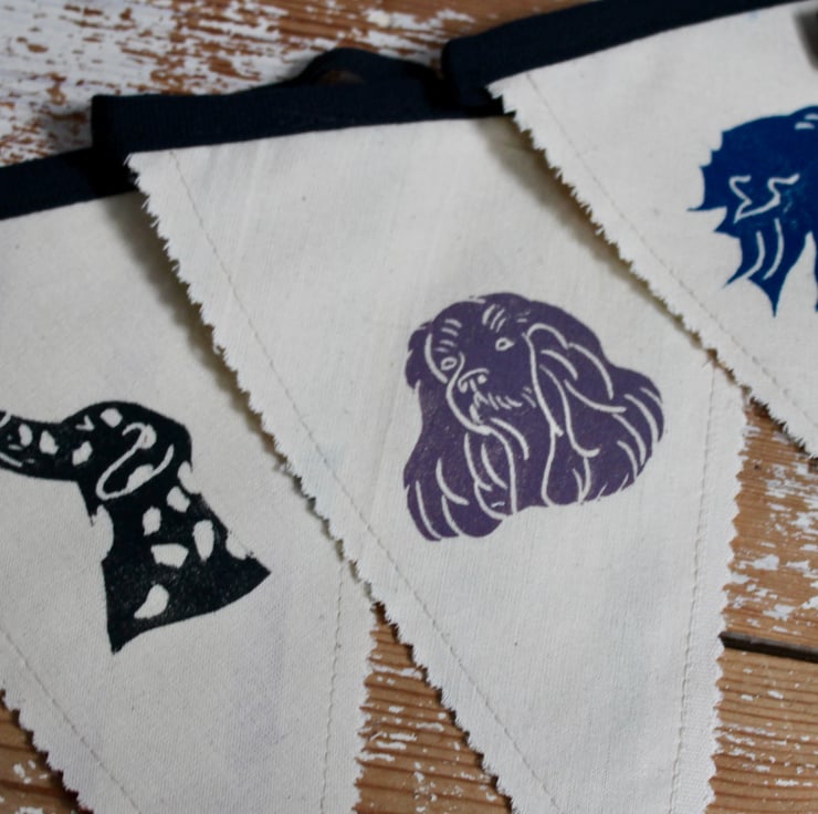 This cheerful dog bunting has been made using an original designed lino print. Various dog designs are featured on one side, while lino printed stripes are hand printed on the reverse.