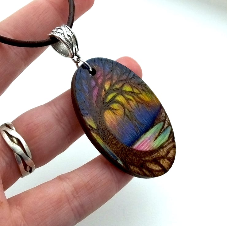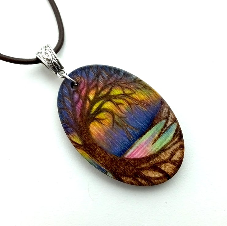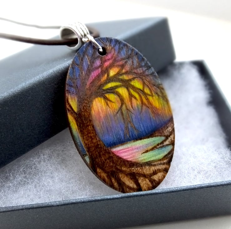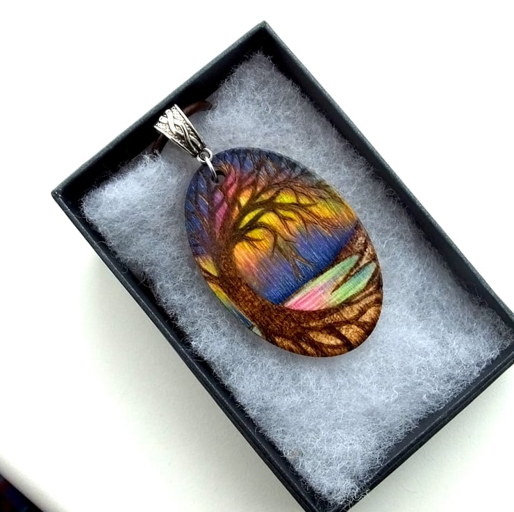 This listing is for an oval wooden pendant, hand burned with a coastal scene, showing beautiful Northern lights overhead, created using pyrography and coloured using prismacolour pencels, inks and posca paint.