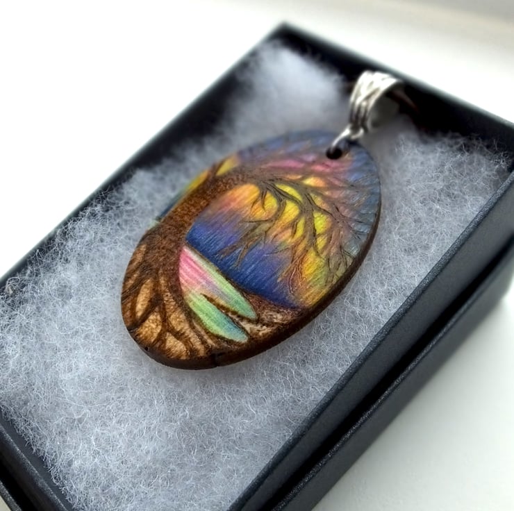 My sister visited Iceland for her birthday and unfortunately didn't see the Northern lights, so I created a personalised gift for her, using one of her photos and burned it into a keyring, paired with beautiful Aurora colours. Since, many people have asked for this effect, so I thought I'd offer it on a pendant. I can do custom scenes, just ask.
