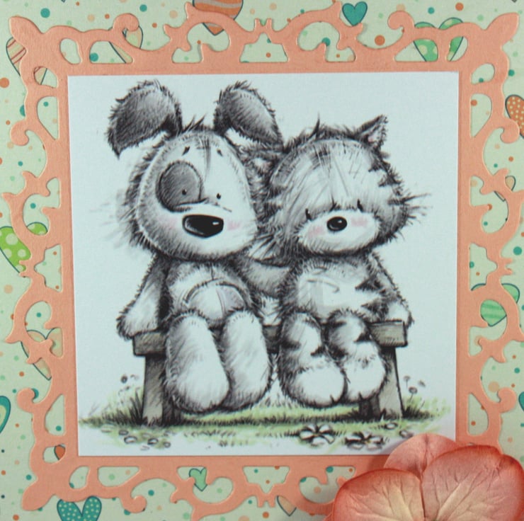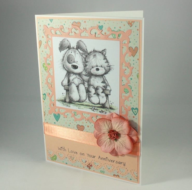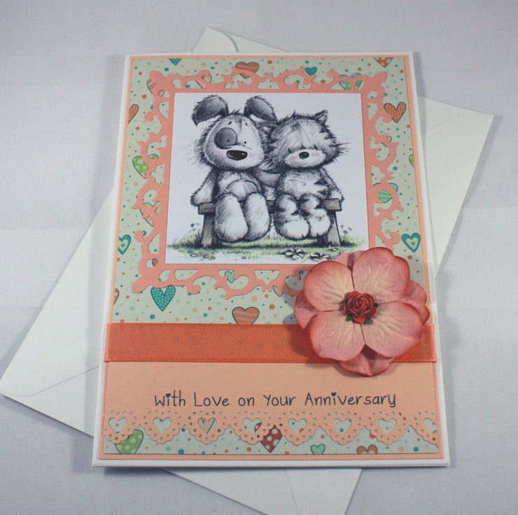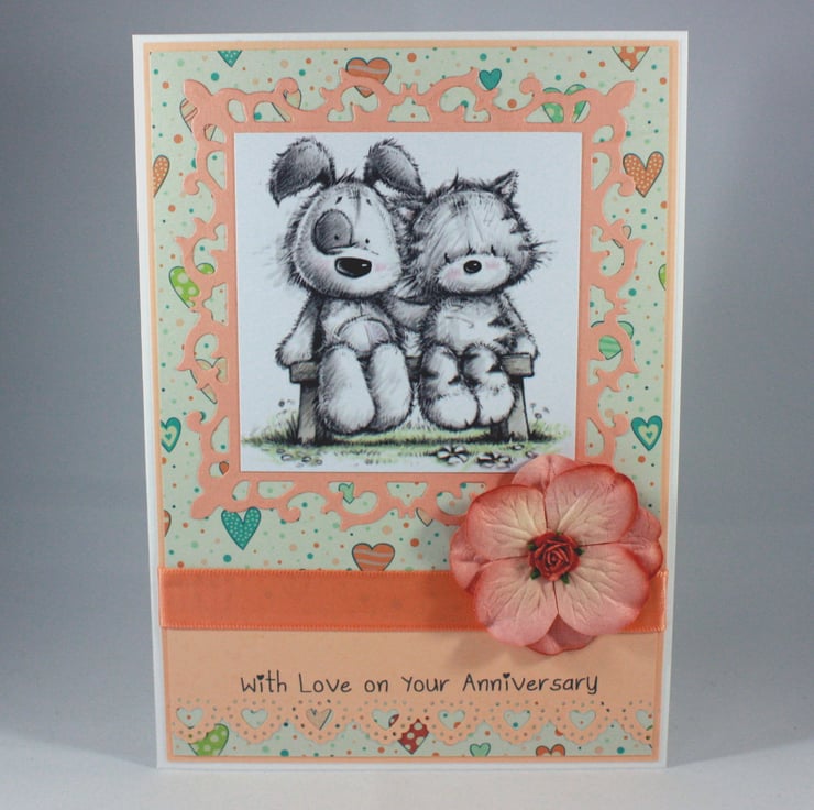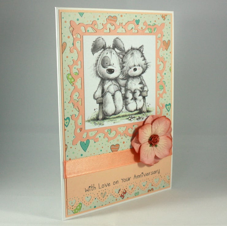 Cute anniversary card, perfect for animal lovers, featuring a cute cat and dog sitting together on a bench. The image is mounted on a fancy die cut frame over a heart patterned background.