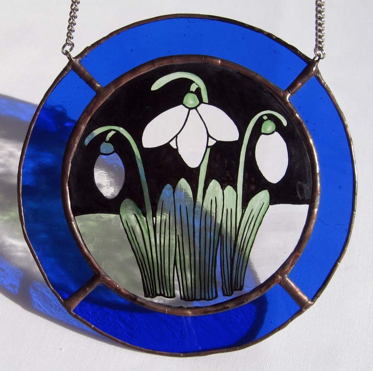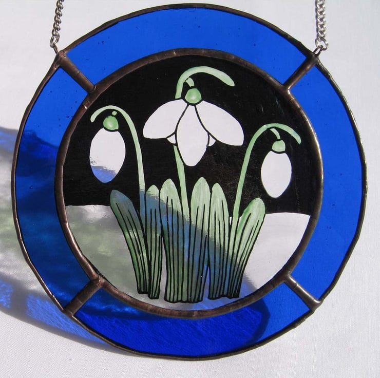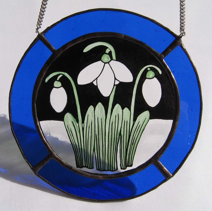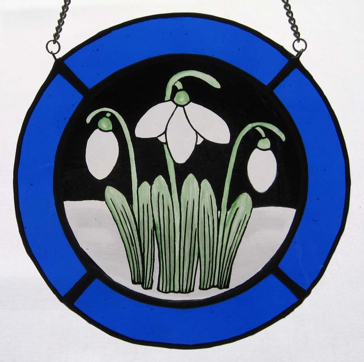 This roundel measures 14 cm diameter and has been created using traditional stained glass techniques and materials. The Snowdrop image has been painted onto antique style, clear glass and bordered with blue to create the snowy scene.