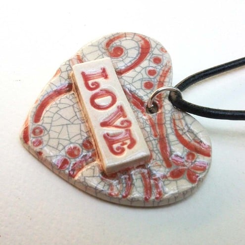 This cute little red heart is made from white earthenware clay, embossed with a swirly background, coloured and glazed with a vintage looking crackle glaze. It is topped off with the word "Love"