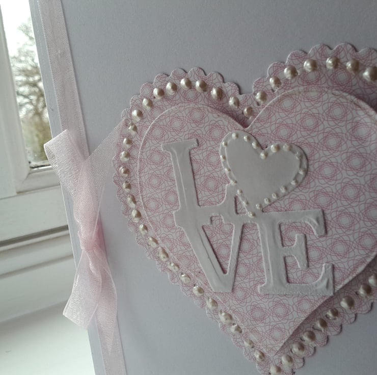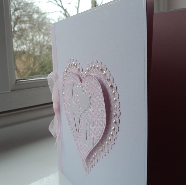 A completely handmade and uniquely designed card. Consisting of two hearts die cut from pretty pastel pink paper, one edged in pearl and the larger o e with pearl dots. A love die cut from shiny white card the heart edged with pearl dots. Mounted onto quality pristine white card all edges have a subtle pearl line. Finished off with a ribbon and how in pale pink organza ribbon.