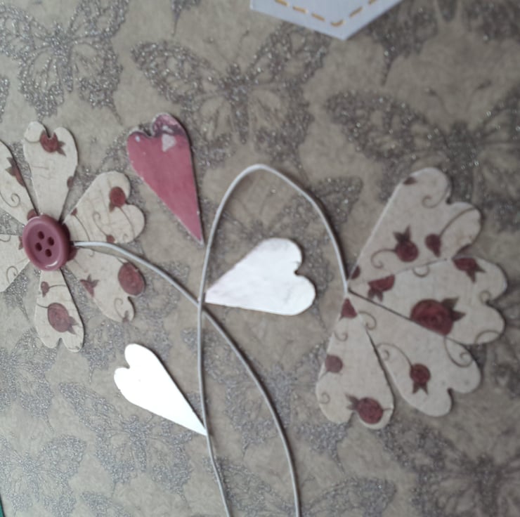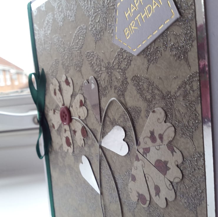 A completely handmade and uniquely designed card. Consisting of two flowers made from florists wire, the leaves and flowers PU check from silver Morris and quality flower patterned card. Mounted onto the