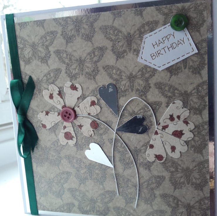 Glitter embossed butterfly card and then onto quality pristine white card. Embellished with happy birthday tag and buttons. Finished off with emerald green ribbon and bow