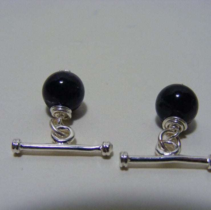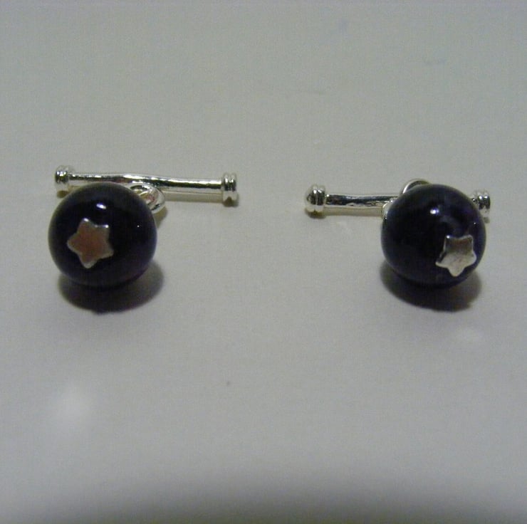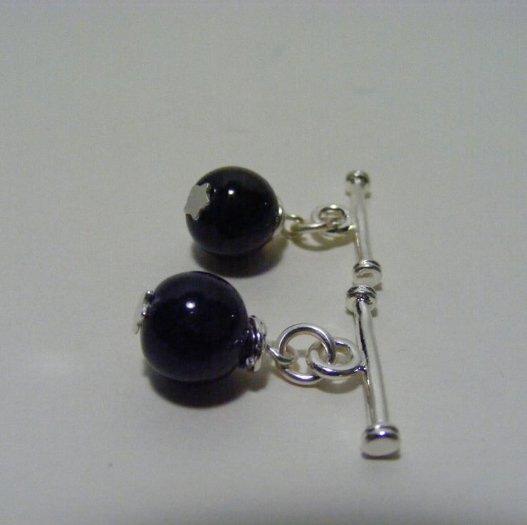 Semi precious cuff links are made with 9 mm amethyst gemstone round beads which are threaded and wrapped on silver plated star ended headpins. Attached jump rings and bars are also silver plated.