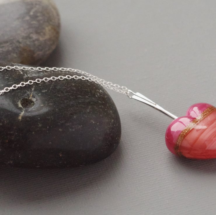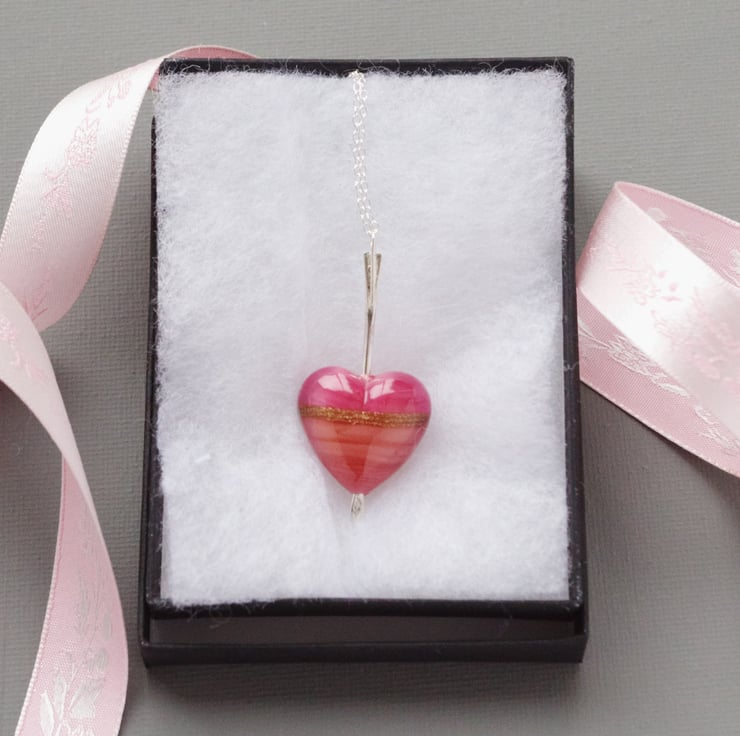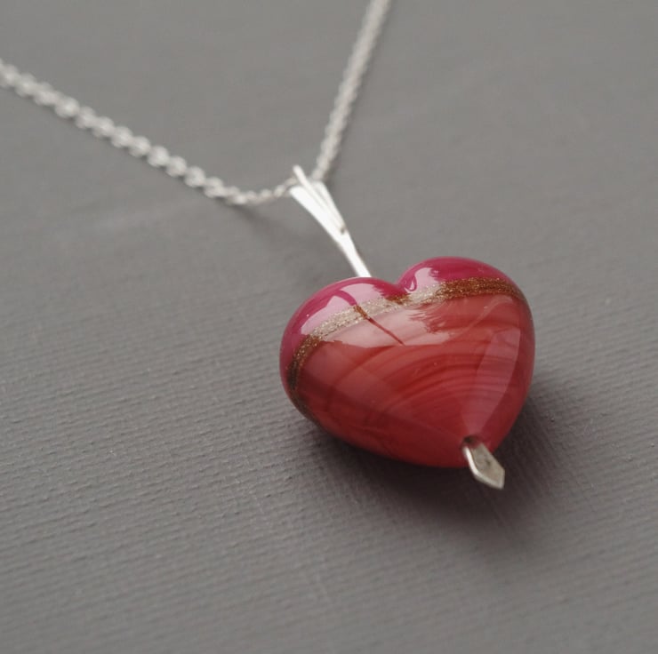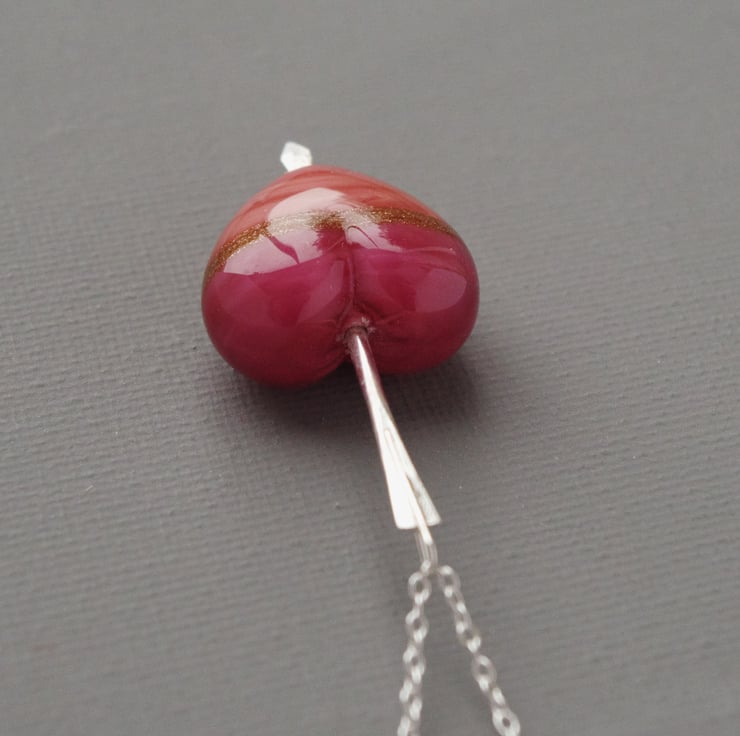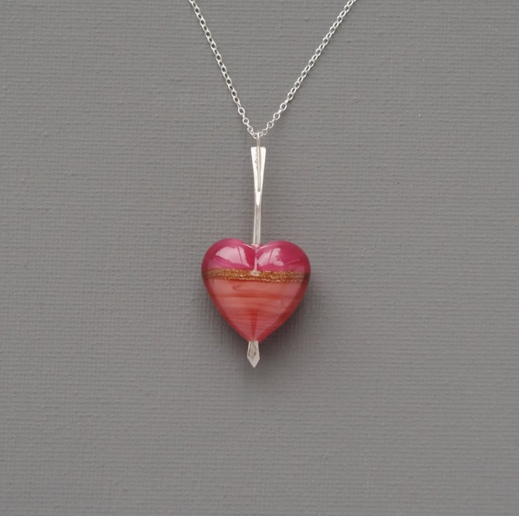 An unusual and elegant minimalist pendant featuring a genuine Murano heart bead in rose pink and shell pink with a glittering gold stripe pierced with a Sterling Silver arrow. I made the arrow by hammering and shaping the metal shaft by hand. The marks from the hammering proces have been left in to enhance the hand-crafted feel. This unique pendant measures 40 mm 1 1/2" in length and hangs from a 450 mm 17 3/4" sterling silver chain.