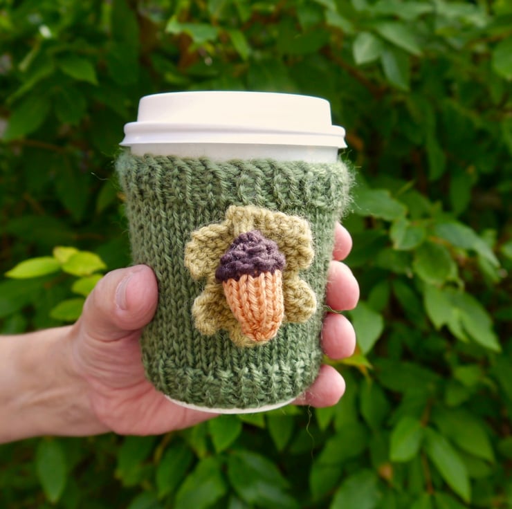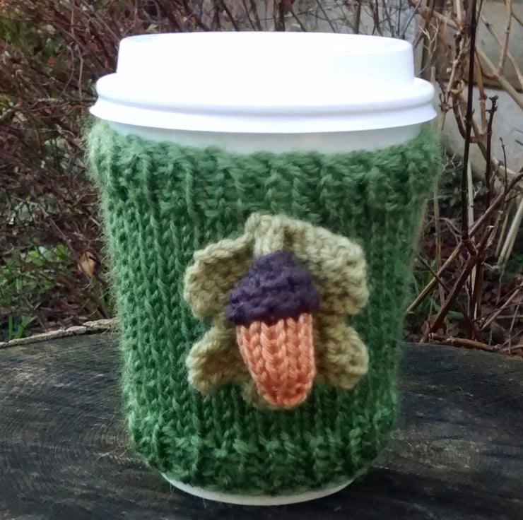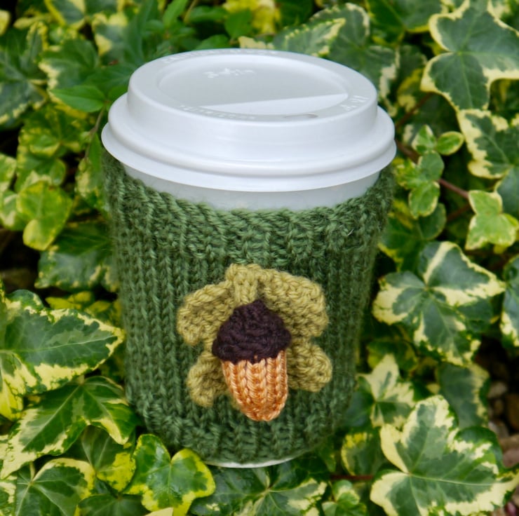 No more takeaway coffee cups that are too hot to hold. Keep one of these handy little cup sleeves in your handbag, workbag or pocket to put on your takeaway drink. I have hand knitted this sleeve using a lovely aran yarn and attached an acorn and oak leaf to match. It will fit a standard size takeaway cup and measures approx 8cm in height.