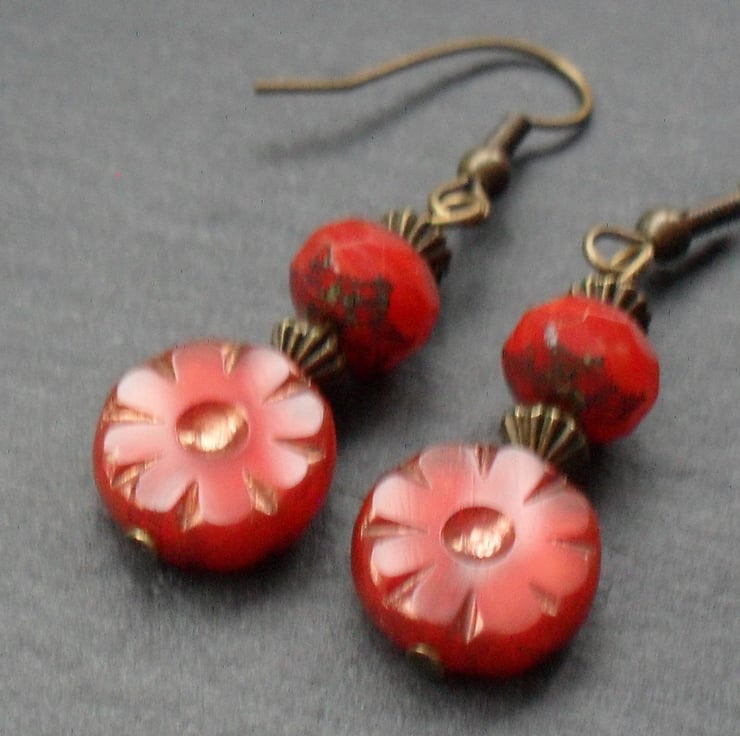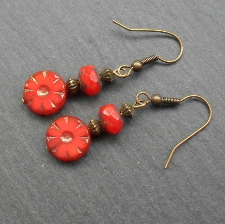 Red Czech glass beads and antique bronze spacer beads are attached to antique bronze coloured ear wires