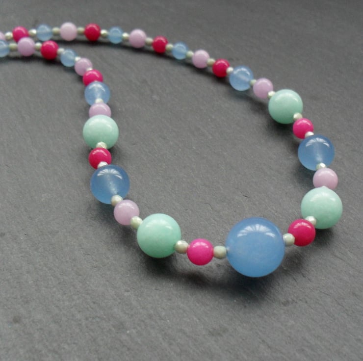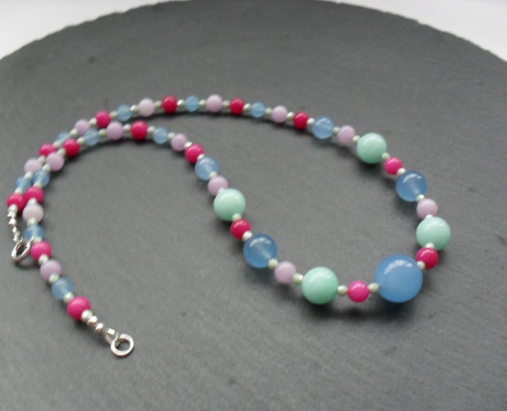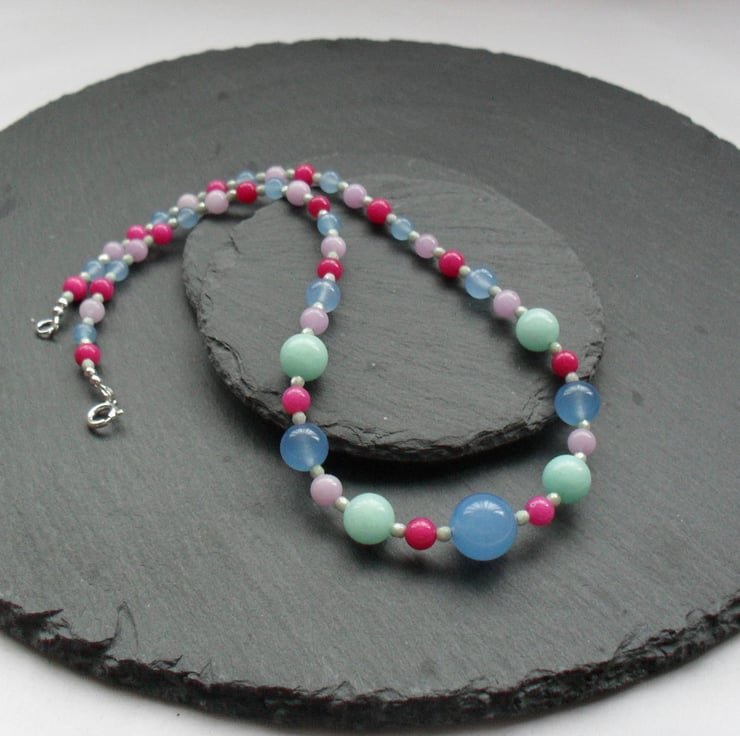Quartz and quartzite beads in aqua,blue,deep pink and lilac with tiny czech glass aqua coloured seed beads