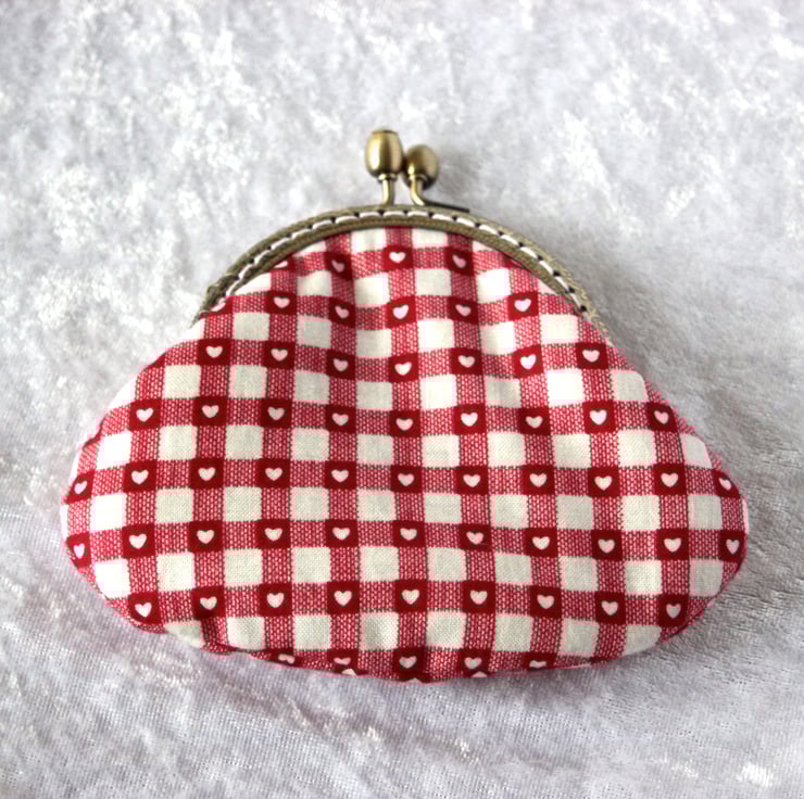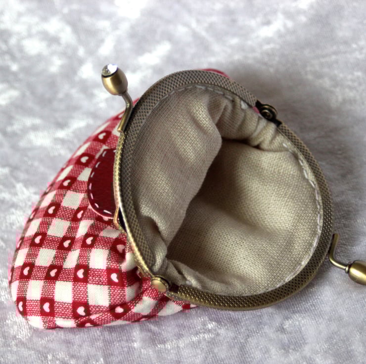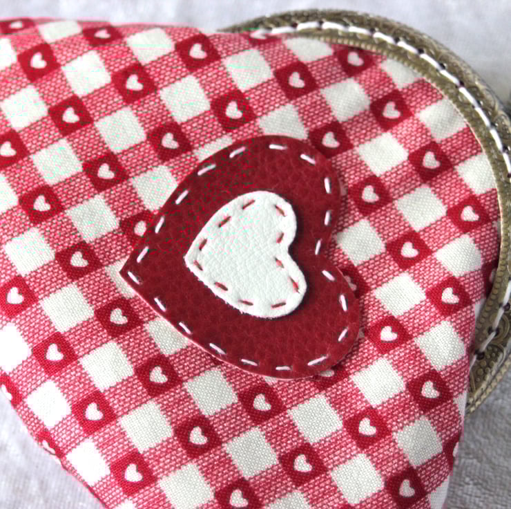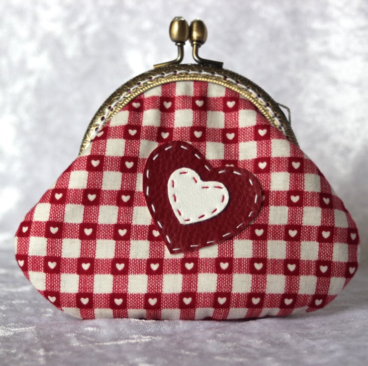 A little token of love that will last all year long and keep your small change safe. This clasp coin purse is made using 100% cotton fabric from the Scandi range by The Henley Studio. In a red and white pattern with a tiny heart motif I have embellished the front of the purse with two appliqued faux leather hearts. The lining is a cream linen style fabric and I have embroidered my initial and year of creation in red within the lining, so you know that you have purchased a Made in the Temple original.