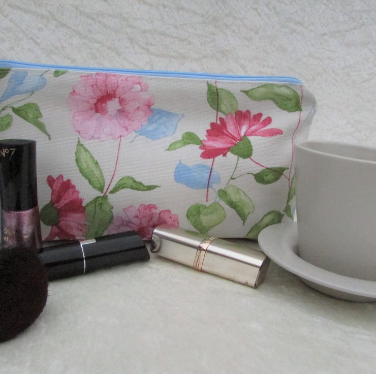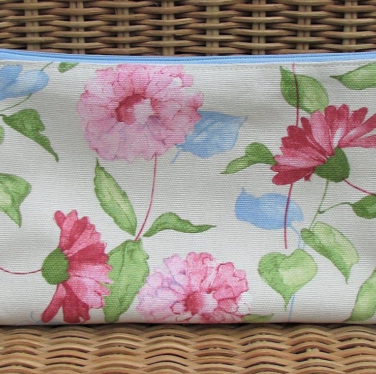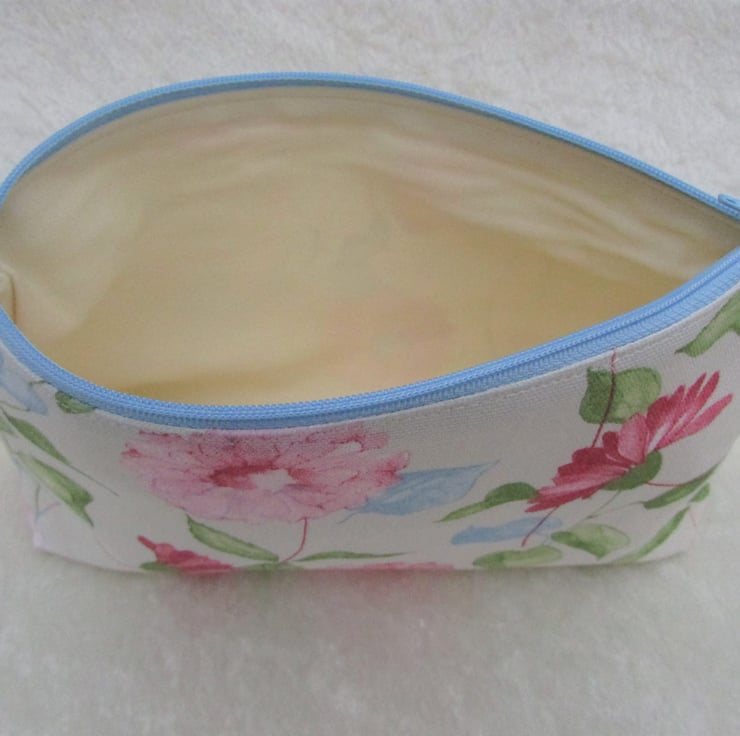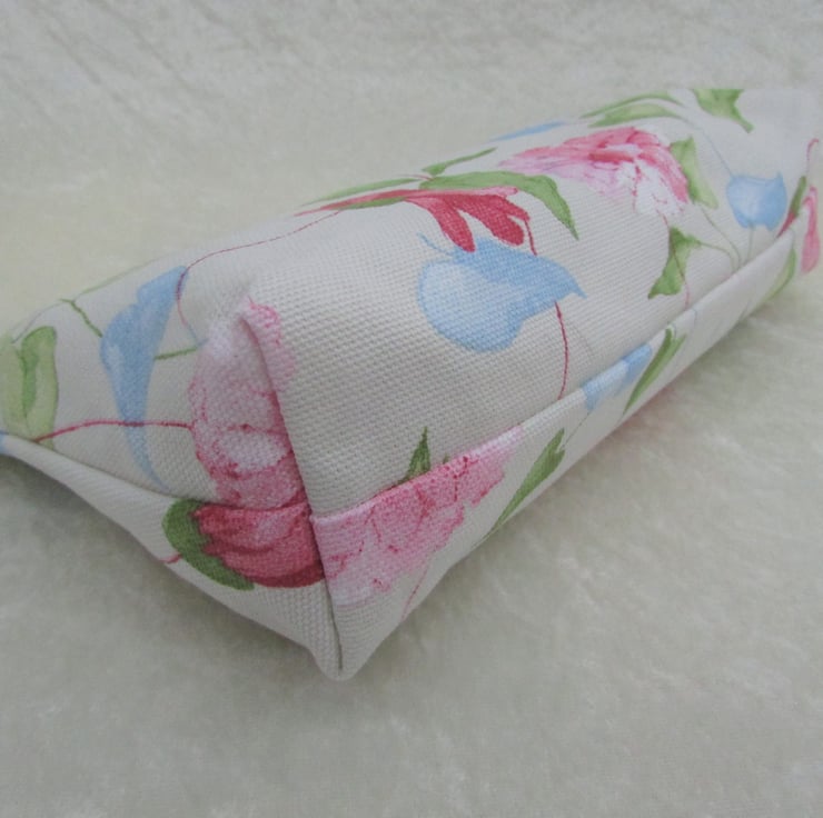 A pretty cosmetic bag in cream fabric with a delightful floral print in pastel shades of pink, green and blue. The make up bag has a co-ordinating pale blue zip and is lined with cream fabric. The base of the bag is boxed giving lots of space inside.