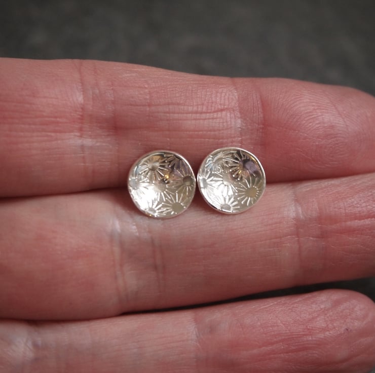 A bunch of daisies has been punched into discs of sterling silver to give a pretty surface texture for these earrings. The discs have been domed to create a lovely bowl shape and polished to a bright shine.