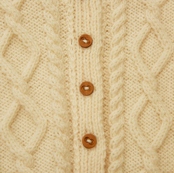 Hand knitted aran style cardigan with cable patterns on the fronts and sleeves with a plain back.