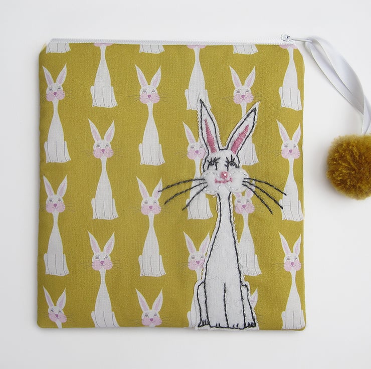 I have made this bag/pouch in my own mid-century rabbit print on mustard coloured cotton. The pouch also has an appliquéd rabbit on one side in white with pink details and bead work. The lining is white and the zip is white. I have added a ribbon zip pull with a fluffy mustard pompom to suggest a rabbit tail. The bag measures 17.5cm(7 inches) by 17.5cms(7 inches) depth,