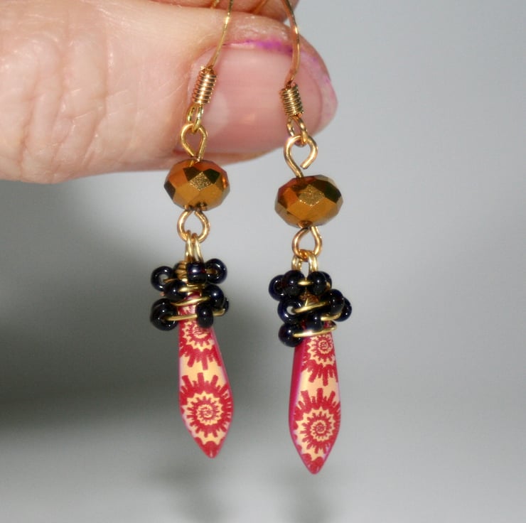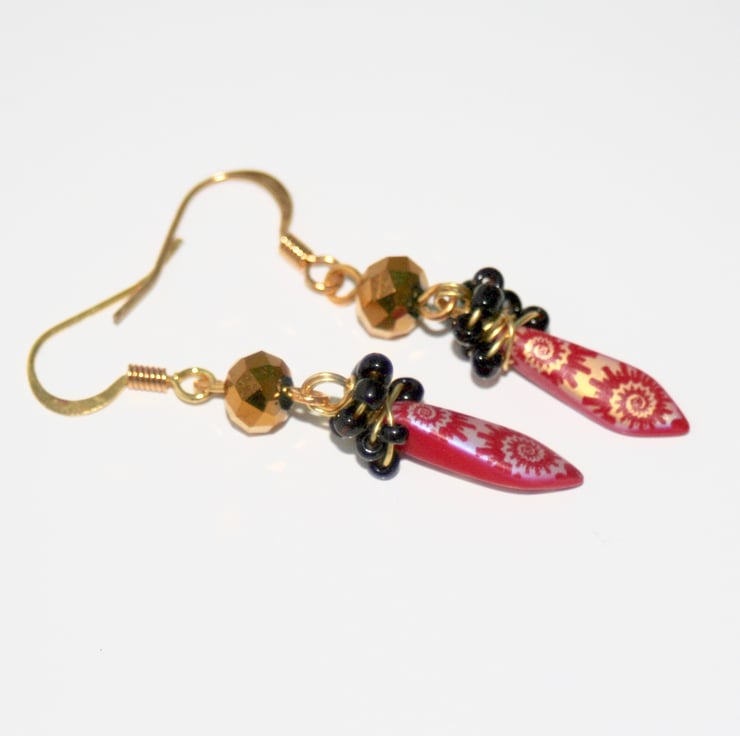The bright earrings are made with fantastic red and gold spiral-patterned dagger beads, gold faceted crystals and wire-wrapped black seed beads.
