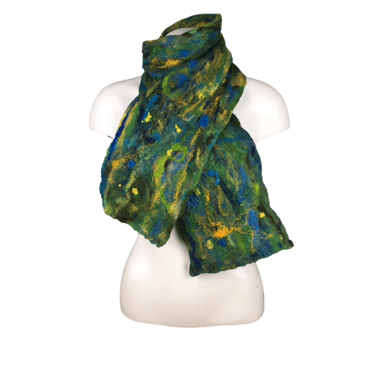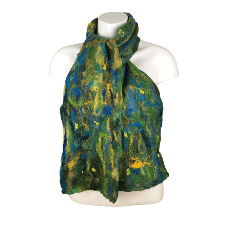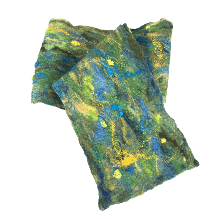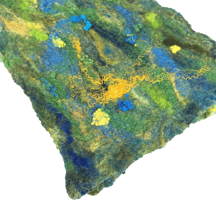 This scarf has been wet felted using various blends of merino wool, silk and other fibres carded together to create a glorious display of colour. Blue and green silk fibres, yellow silk strands and blue green and yellow tiny woolly balls and curly wool locks have been added to one side as embellishment prior to felting.