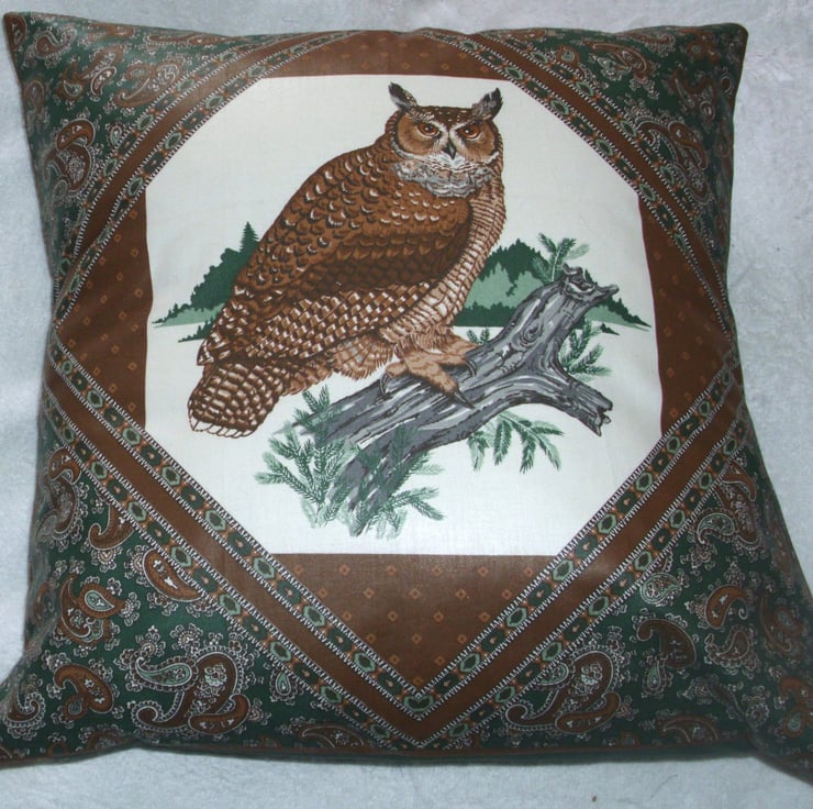 A Square cushion with a beautiful Eagle owl perched on a branch of a tree with mountains and trees in the background. lovely and soft cushion ,would look good in any lounge, sitting room, study or office on any settee or armchair or in a conservatory or summer house or on a bed.
