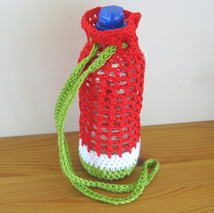 Handy little bottle holder with hands free strap. Fits a standard 500ml (1 pint) bottle but the strap be adjusted to fit any sized bottle.
