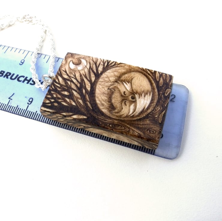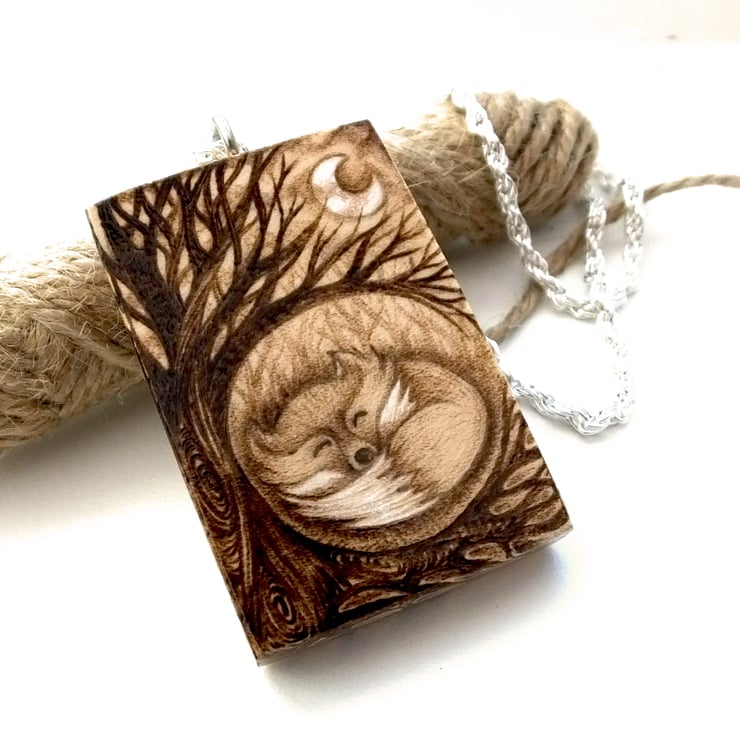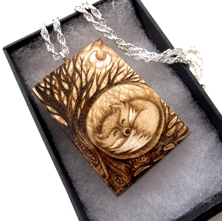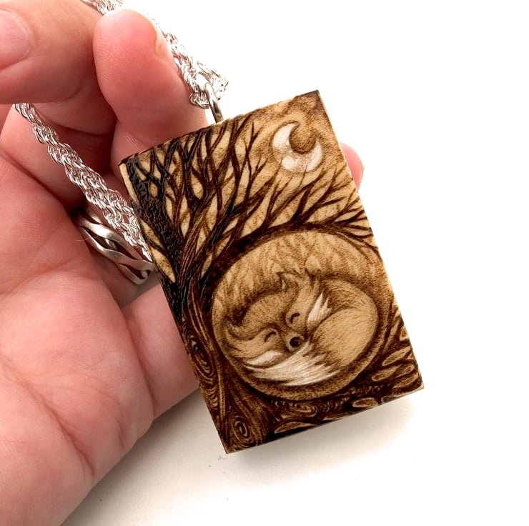 Here we have a gorgeous fox or vixen napping among the trees in secluded woodland copse. The design is achieved using free hand wood burning or pyrography, decorated on all edges and sides except the reverse, with highlights picked out using white prismacolor pencil.