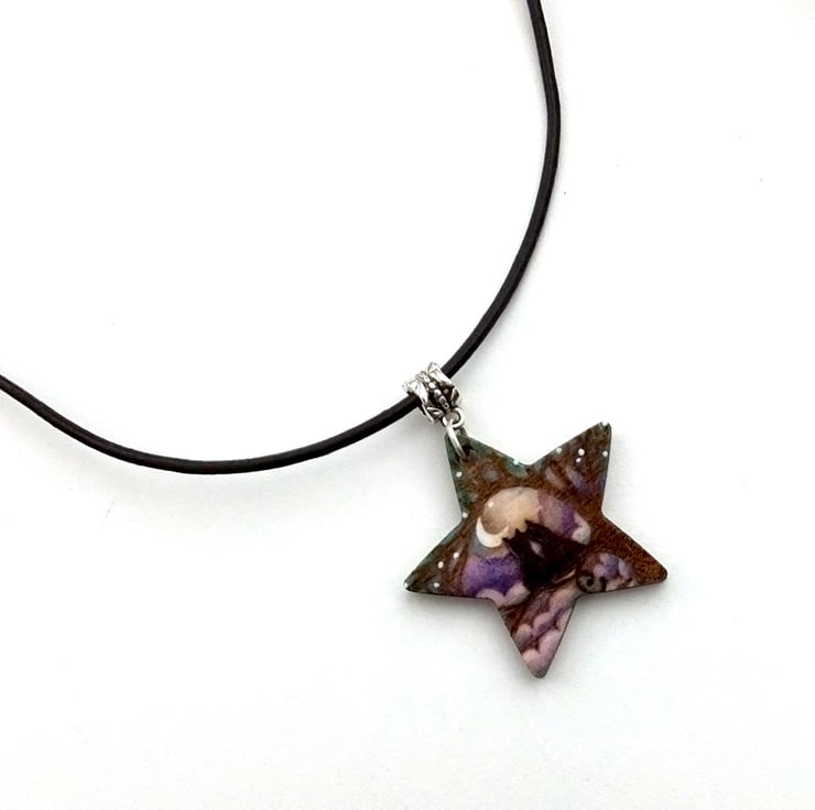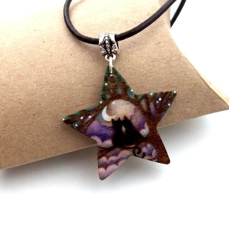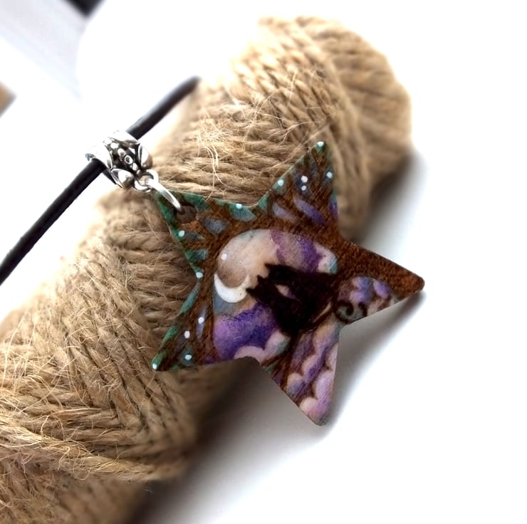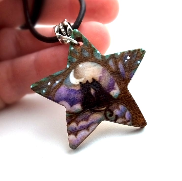 This listing is for a star shaped wooden cats or kittens themed pendant. It is designed by myself and incorporates a silhouetted cat theme, on a tree with moon and purple blue clouds, achieved using pyrography, prismacolour pencils and ink.
