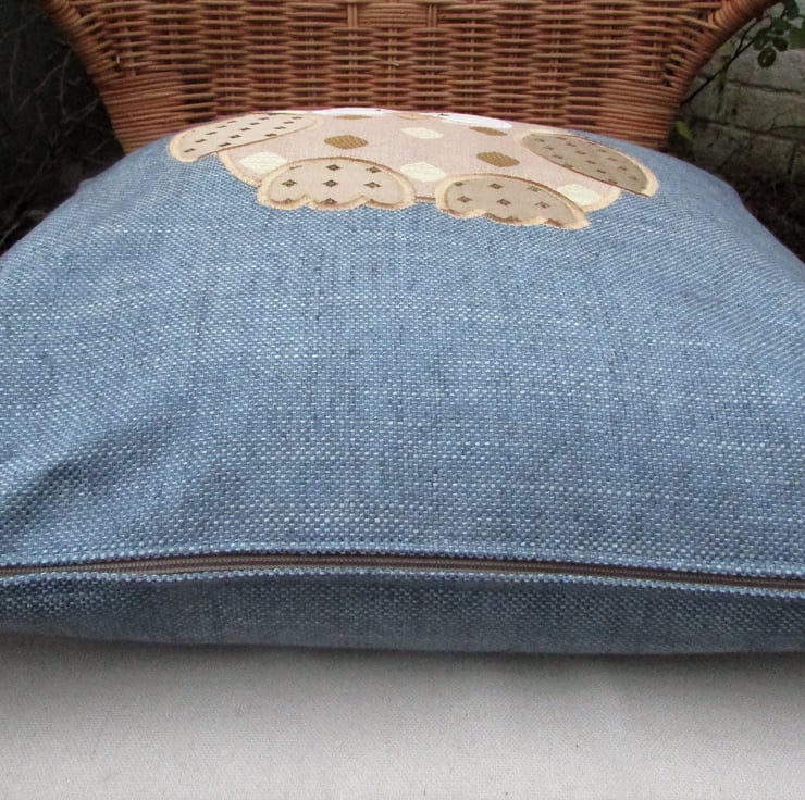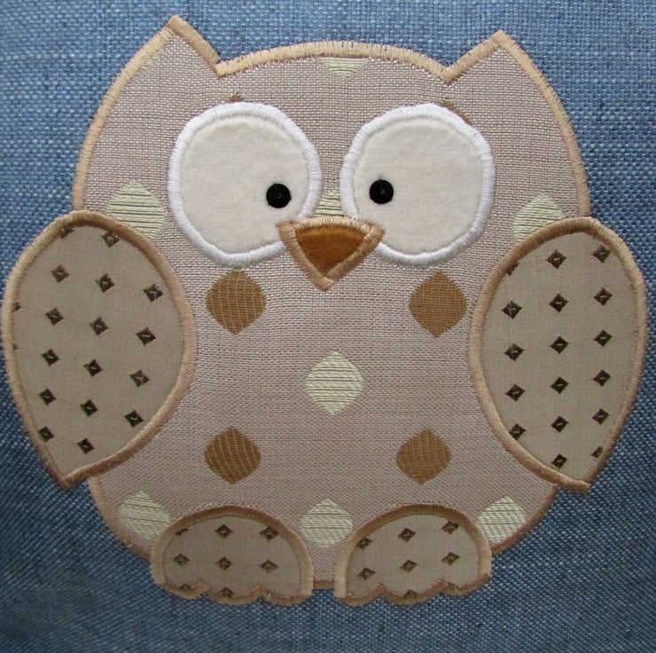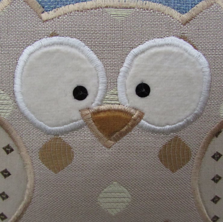 A delightful owl cushion in blue fabric with an applique owl in shades of gold. The body of the owl is a luxurious gold fabric with darker gold and paler gold spots. The wings and feet are also gold fabric with a woven pattern of small diamond shapes. The beak is gold velvet and the eyes are cream velvet embellished with black sequins.