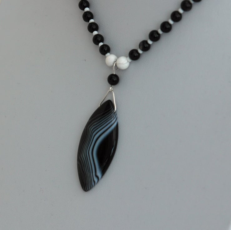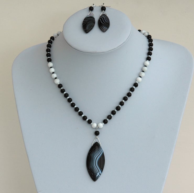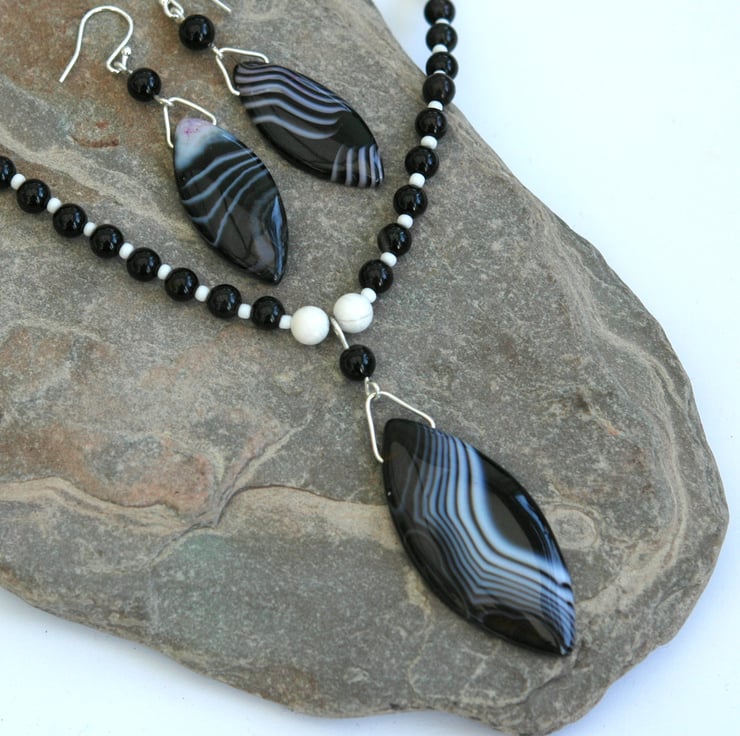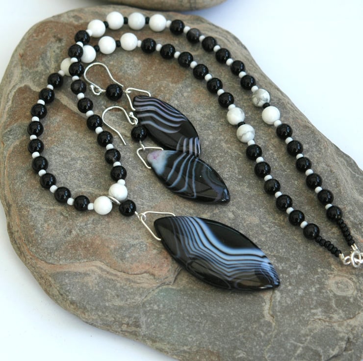 This dramatic monochrome necklace and earring set features a focal pendant of black and white striped agate, complemented by semi-precious beads of onyx (6mm) and white howlite (8mm). The onyx is mainly black with occasional stripes of white. Small black and white seed beads are used to separate the gemstone beads. The length of the necklace is 18in/45cm and the pendant length is 2 2in/5cm. Fastening is by means of a sterling silver bolt and ring clasp.