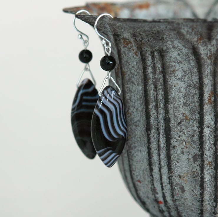 The earrings echo the marquise shape of the focal pendant but are smaller, with a total drop of about 1.7in/4cm below the hook. The swirling patterns on the two earrings are individual, reflecting the unique nature of each stone. They are suspended from elegant silver ear hooks, stamped .925 for sterling.
