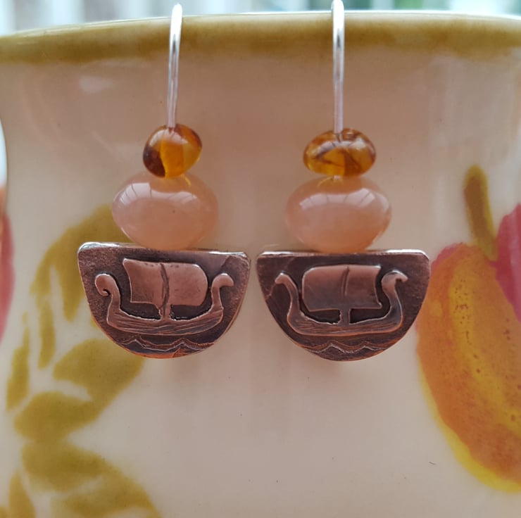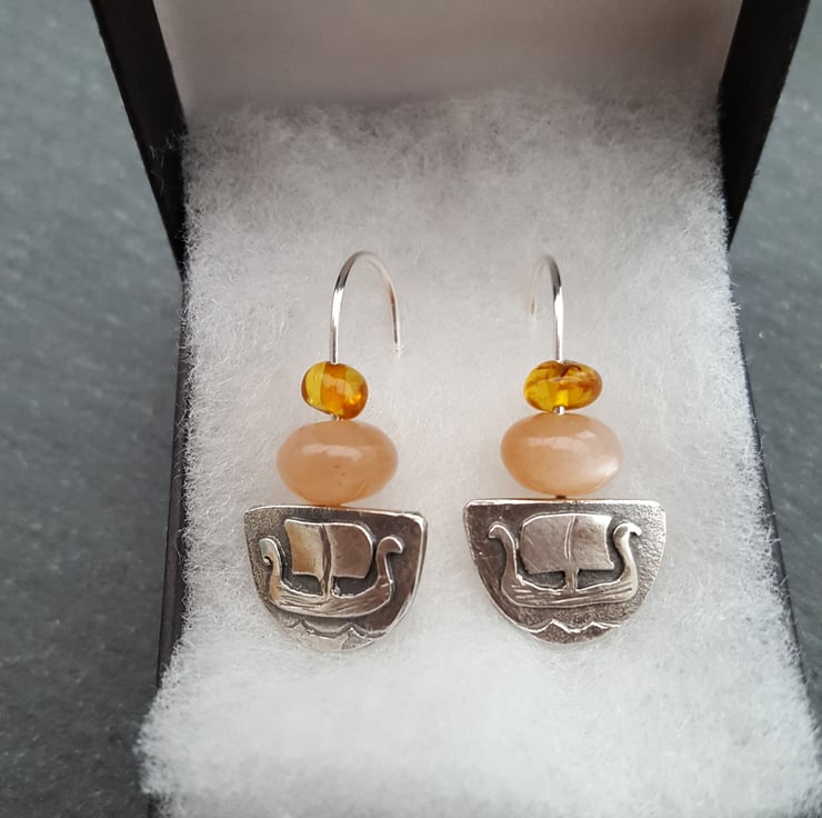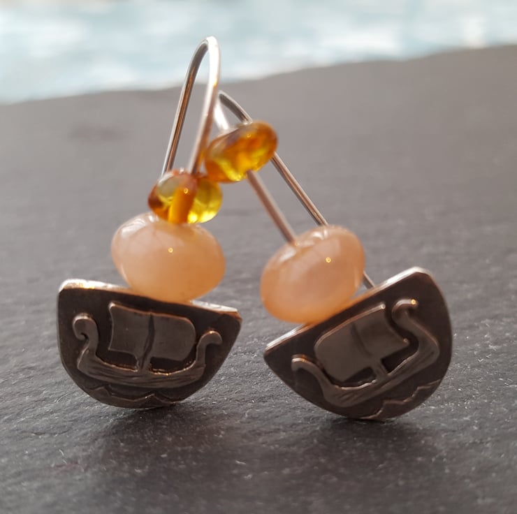 Made using traditional jewellery making techniques, I have pierced out two longships which I have then soldered onto a textured background, adding the ear wires. I have hand engraved the earrings and have finished by oxidising the silver before adding an 8mm sunstone bead and an amber nugget.