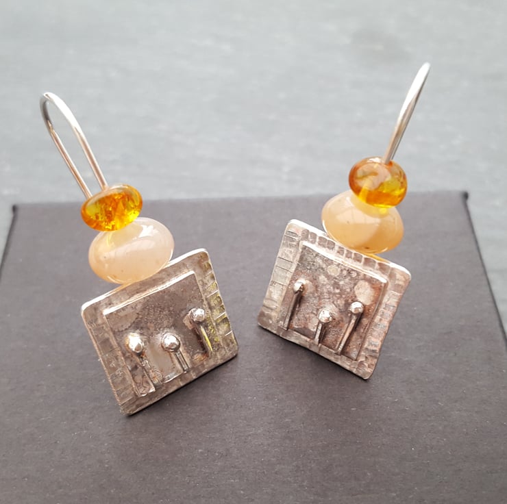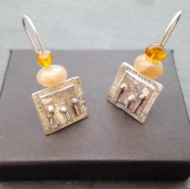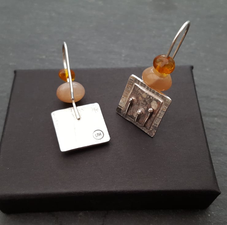 I like to experiment with silver and love to layer, creating frames and pictures. I have kept these earrings quite simple but have allowed some of the patina created during the soldering process to stay which gives them a more aged appearance. For warmth I have added sunstone and amber beads which are beautiful stones to work with.