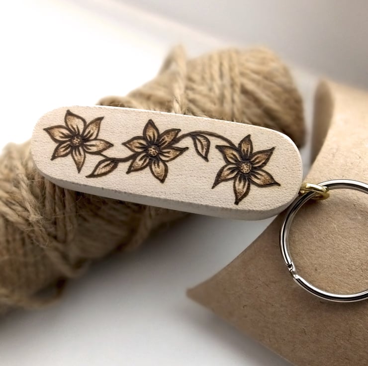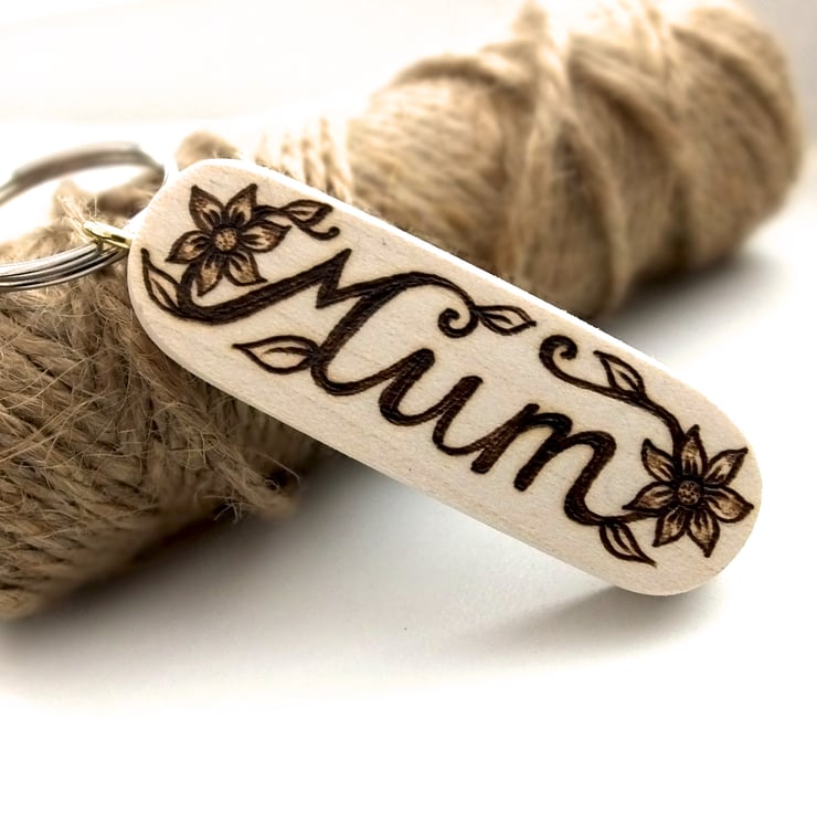 Here we have a beautiful, chunky sycamore wood keyring with 'Mum' written on one side and 3 flowers on the other. The images and text are created using pyrography. This item is made to order, so yours will be similar, but not the same. If you would like some additional text or decoration on the sides, let me know and I will add it for you. Something like a date, or one or two words will fit. I can add some leaves or small flowers if you prefer.