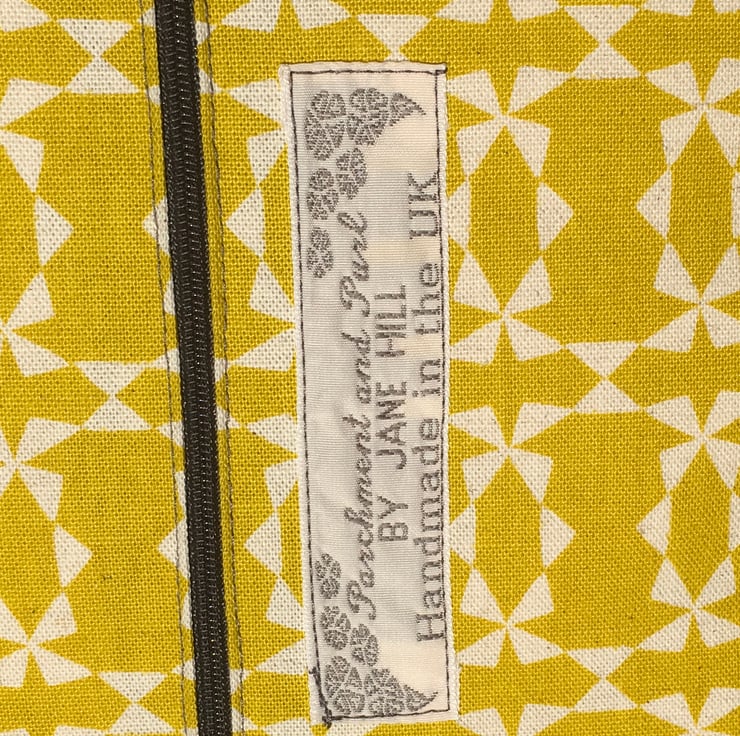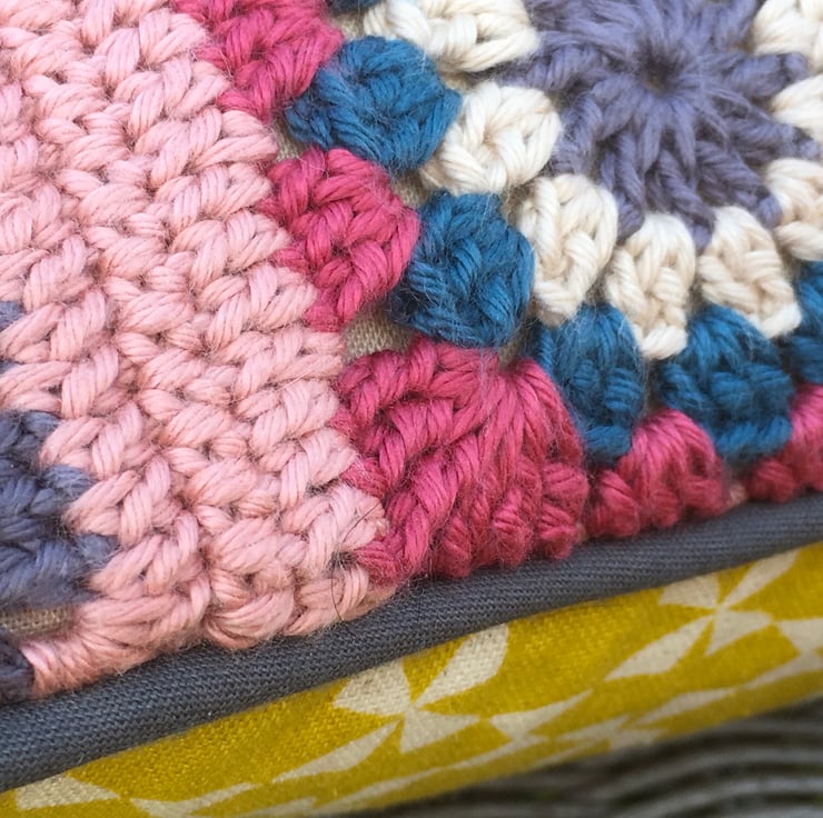 Crochet cushion in a rich mix of vintage inspired cotton yarns. Crochet to the front of the cover and a co-ordinating bold linen print fabric, central zip and makers label at the back of the cover.