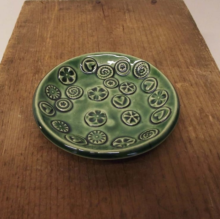 This teeny, little decorated dish, is glazed in a rich, glossy glaze.