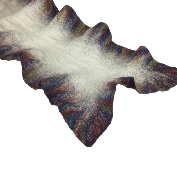 This striking scarf has been made using white merino wool nuno felted onto a white silk chiffon base fabric with a border in a blend of rainbow colours added.