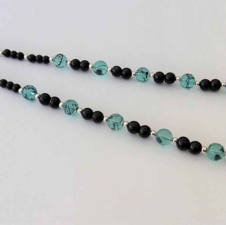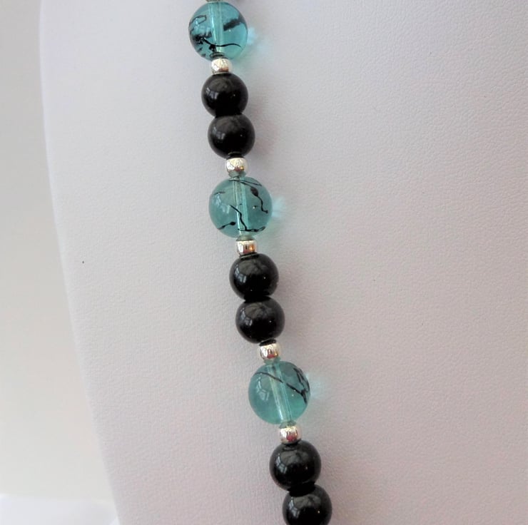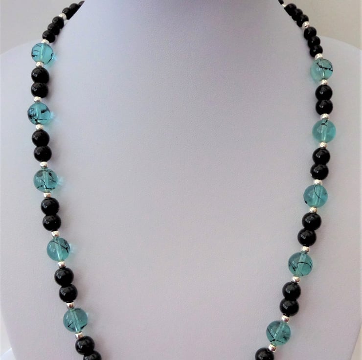 Light blue glass beads with a black drizzle detail and 8mm black glass pearl necklace and 4mm silver plated spacer beads. Measures approximately 22.25 inches and fastens with a silver coloured lobster clasp.