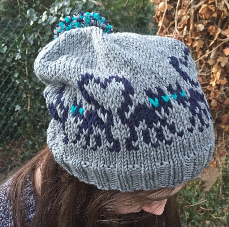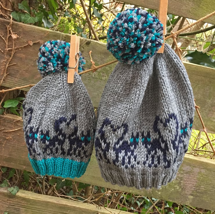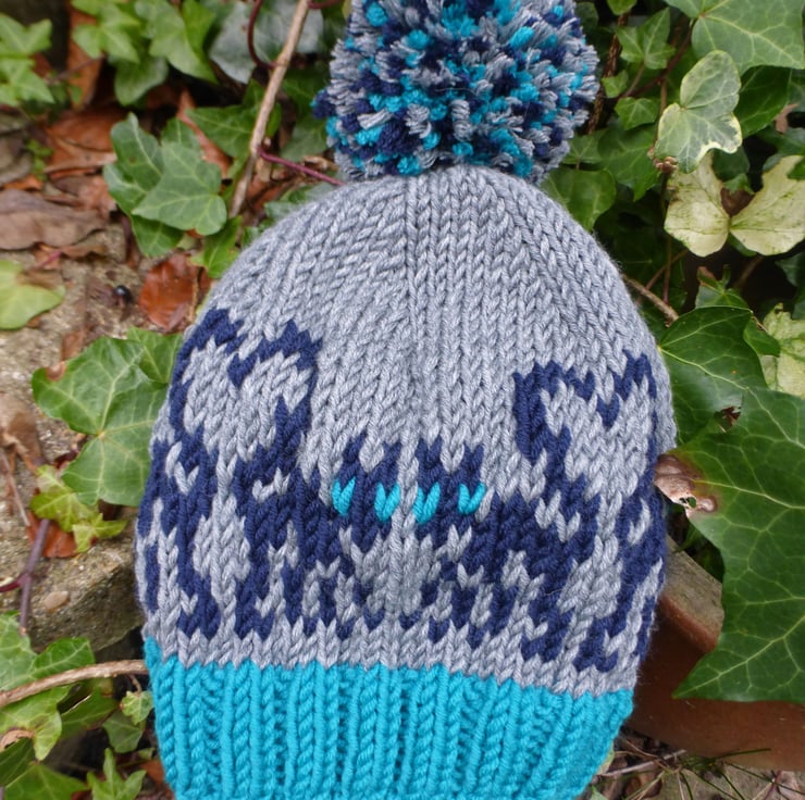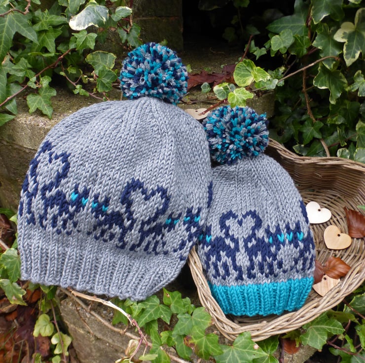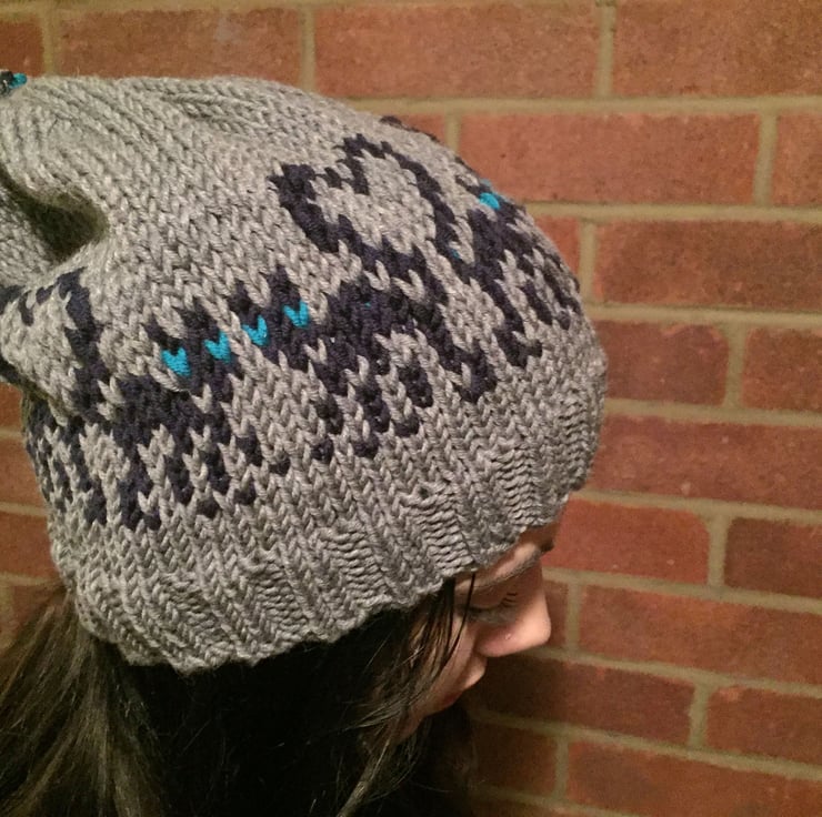 The hat has a ribbed welt and a stocking stitch body with a Fair Isle cat repeat pattern encircling the lower section of the hat body; when paired together, the cats’ tails form the shape of a heart. The motifs are worked using only two colours in a row, with the exception of the cats’ eyes row, which makes this an ideal pattern for those new to the Fair Isle technique.